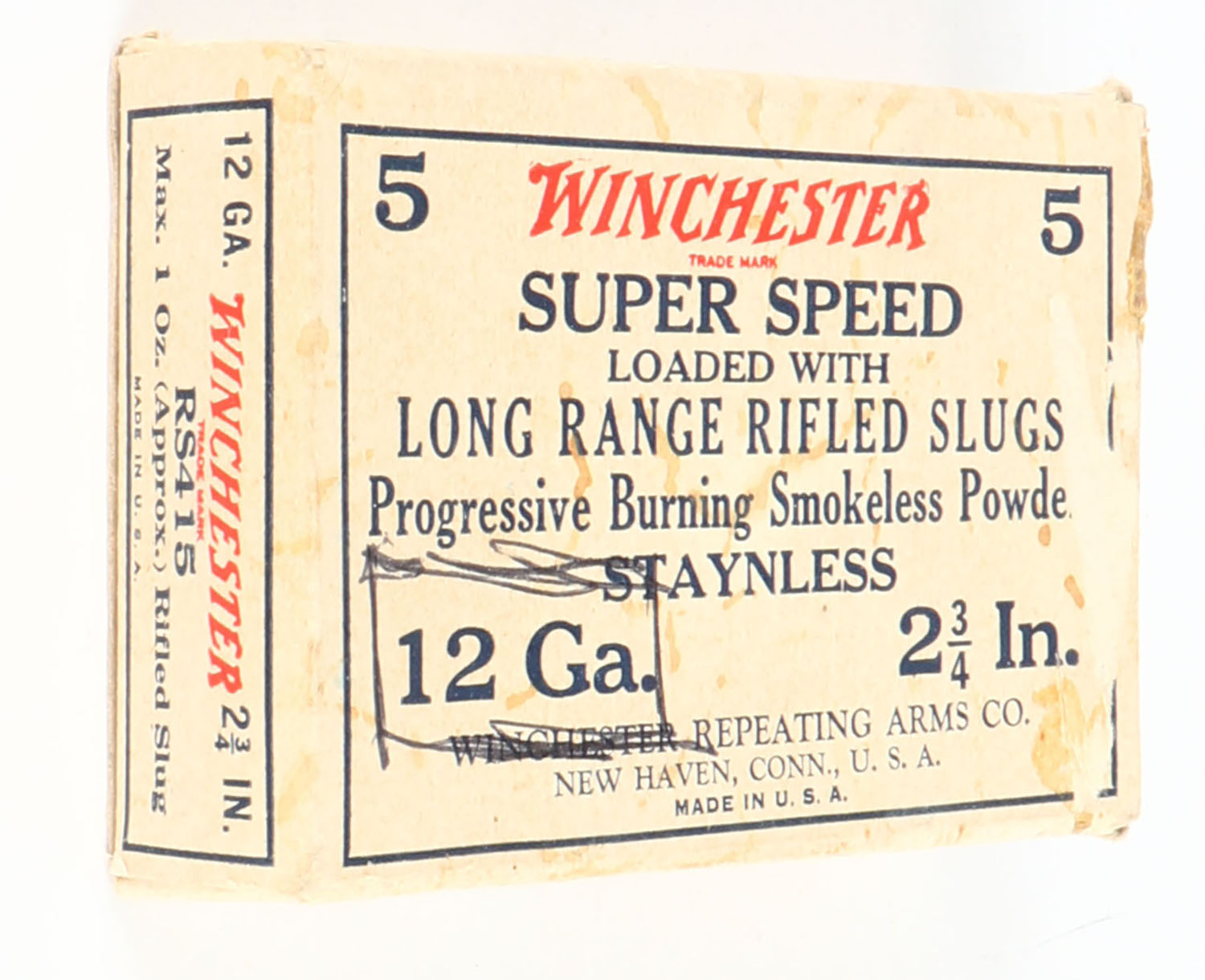 Winchester, Super Speed, STAYNLESS, 12ga., 2 3/4'', 1pc., Full, Rifled Slugs, Buff, blue & red box, box has scuffing with corner wear, paper shells are very good. Grade: Good ++ - Value: 8 to 30