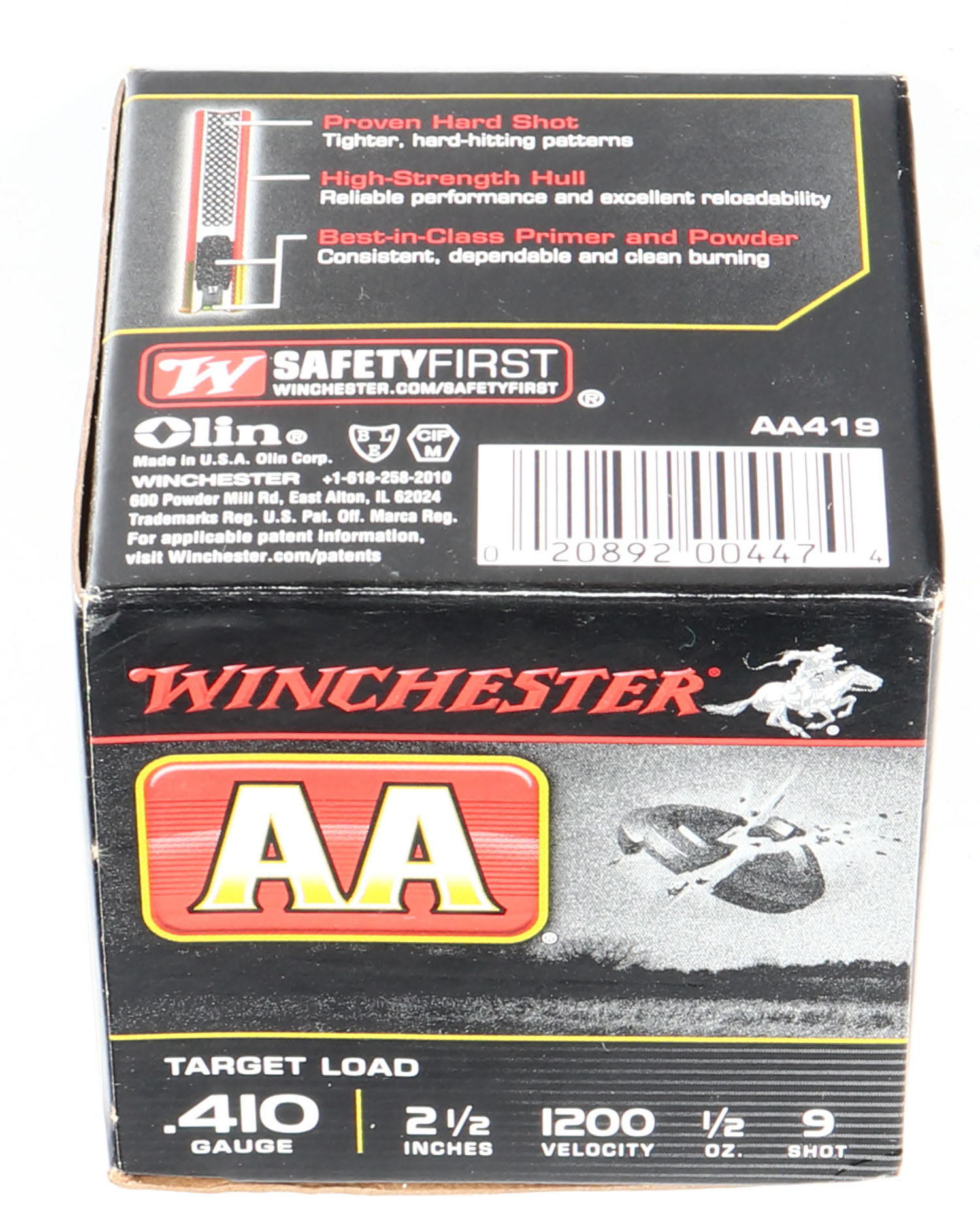 Winchester, AA, Target Load, 410ga., 2 1/2'', 1pc., Full, shot size 9, multi-colored box, box is very solid with great colors, plastic shells are excellent. Grade: MINT - Value: 10 to 30