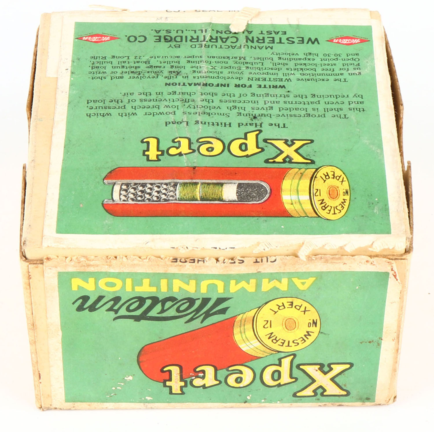 Western, Xpert, 12ga., 2pc., Empty, shot size 6, 3 1/4 Drs. 1 1/8 Oz., buff box with green, red & black label, box shows dog on point, box has scuffing with light age soiling, Western Diamond Logo on one side. Grade: Very Good ++ - Value: 300 to 600