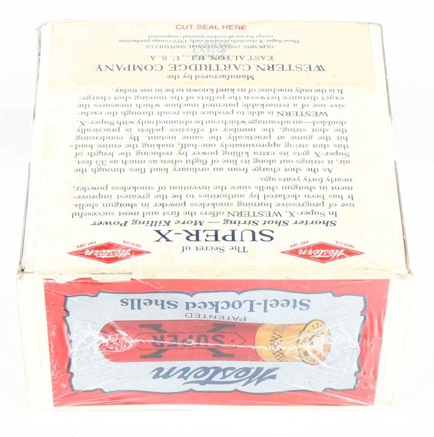 Western, Super-X, 12ga., 2pc., FULL & SEALED, shot size 6 Chilled Shot, 2 3/4'', white box with multi colored label, box & label are great, Circa 1990's. Grade: Excellent ++ - Value: 20 to 80