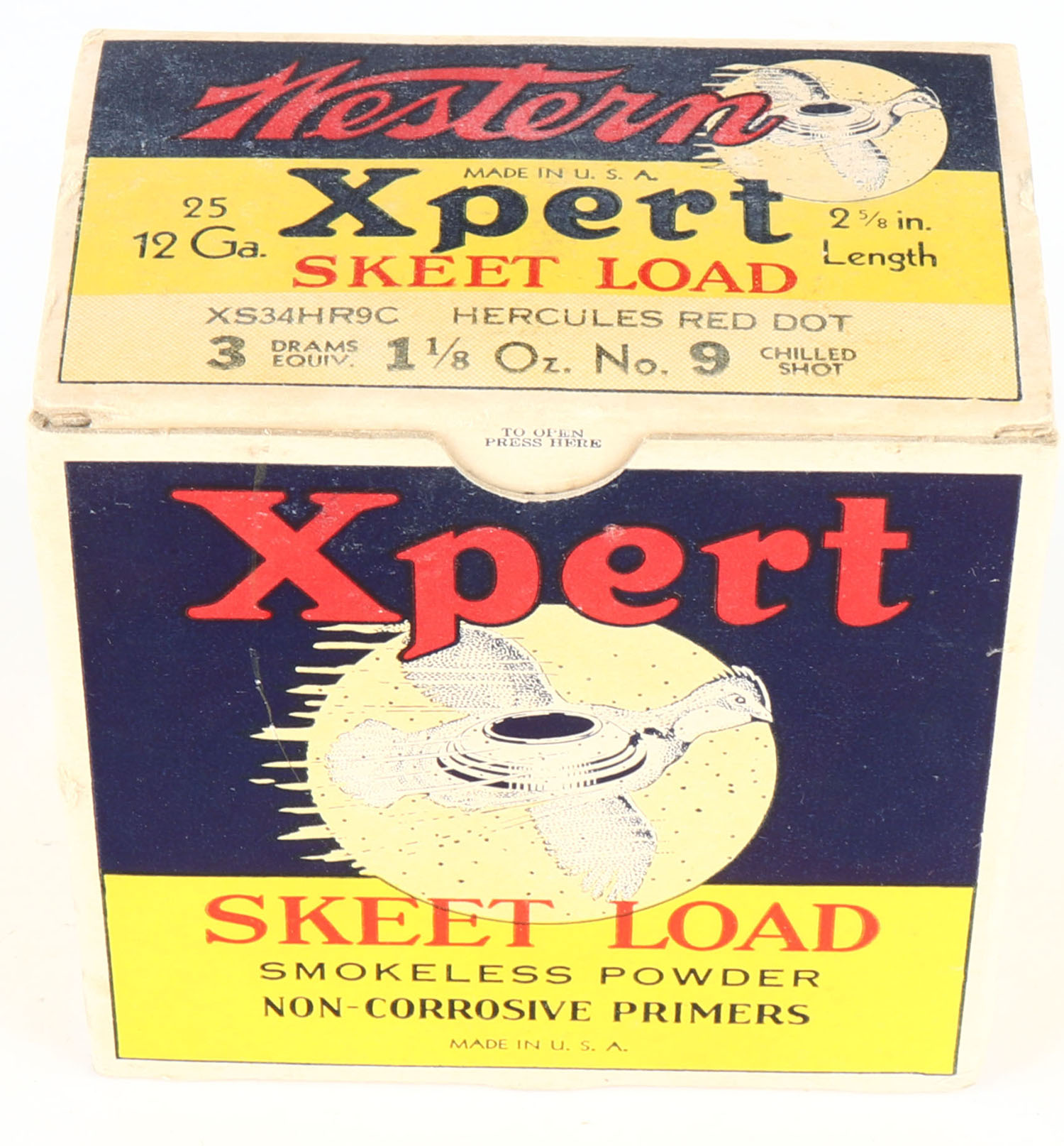 Western Xpert, SKEET LOAD, 12ga., 1pc., Full with Insert, buff box with blue & red on box that pictures flying Quail with skeet in body & shot all around, Loading: 3 Drams 1 1/8 Oz. No. 9 Chilled Shot, box is very solid with great colors, paper shells are excellent. Grade: Excellent ++ - Value: 200 to 800
