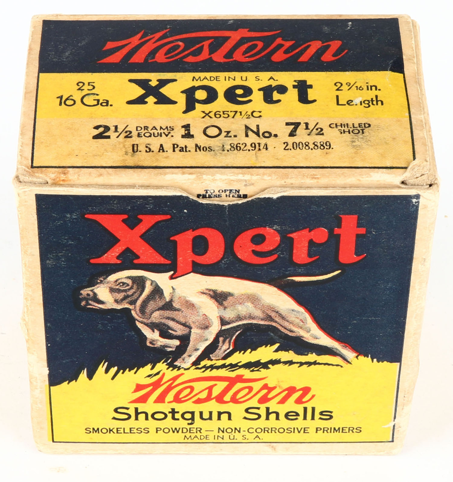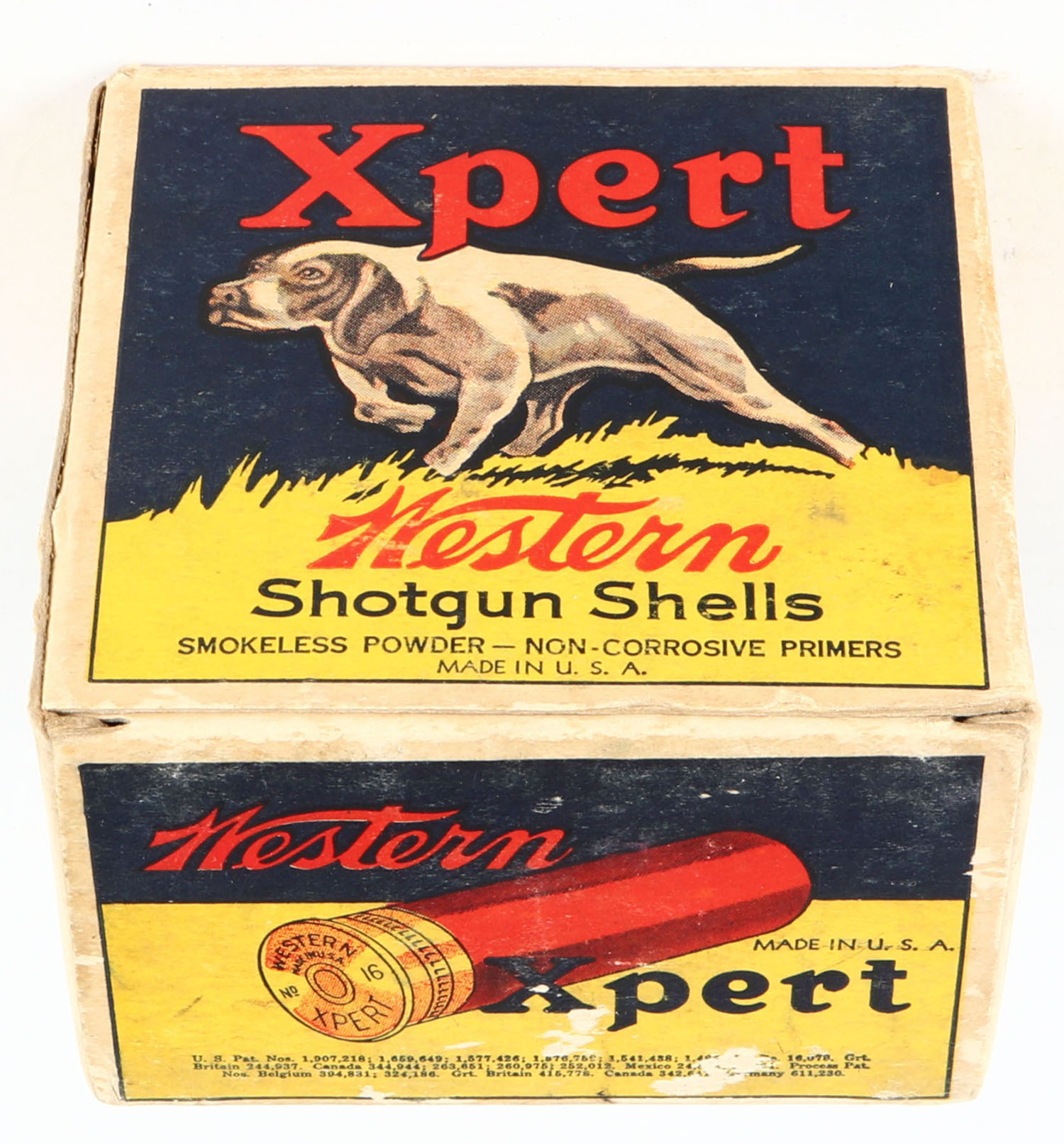 Western, Xpert, 16ga., 1pc., Partial 24rds with 21rds being correct shot, blue, yellow & red box with a dog on point, No. 7 1/2 Chilled Shot, box has light scuffing with great colors, paper shells are very good. Grade: Very Good ++ - Value: 20 to 60