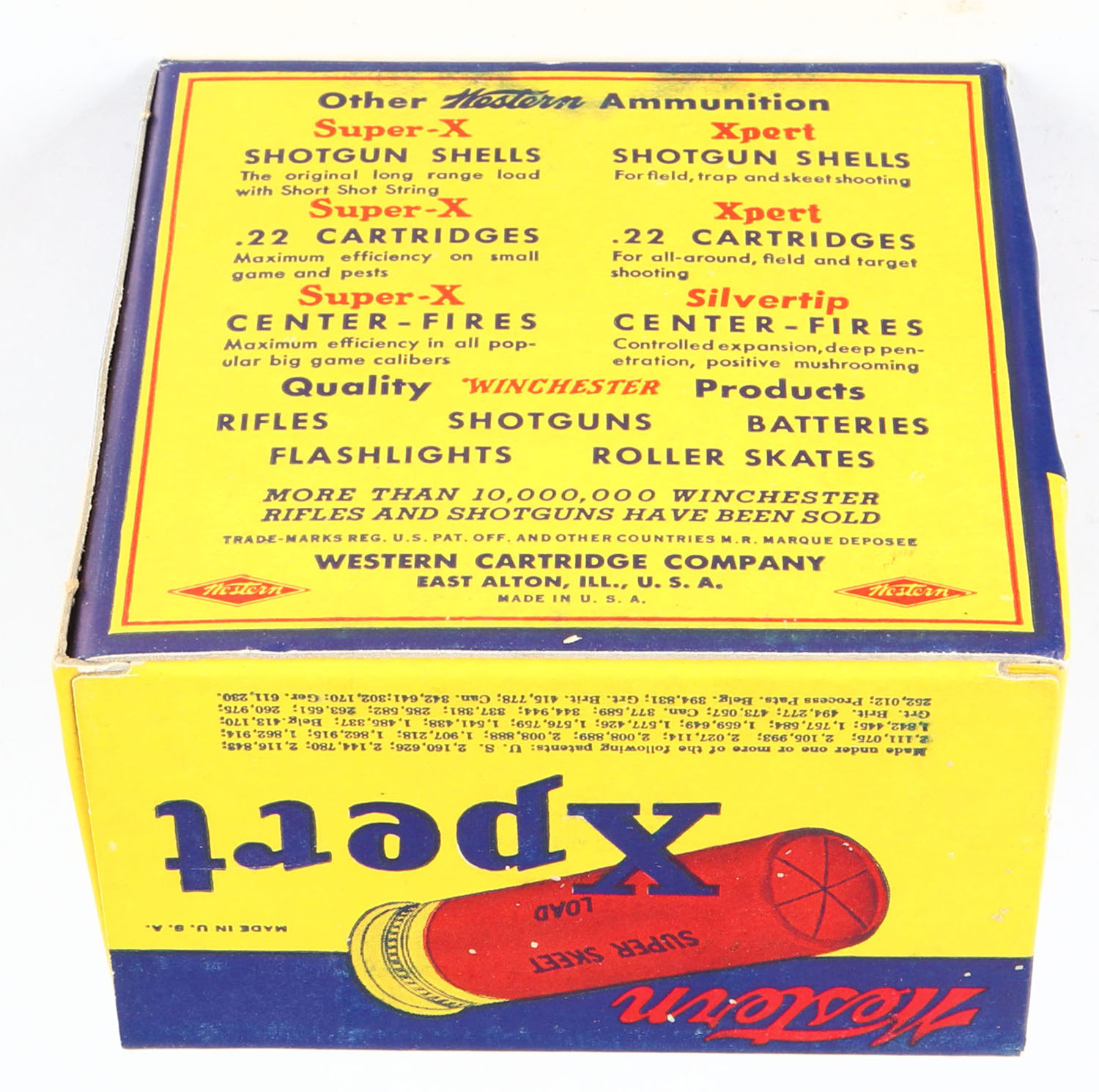 Western, Xpert, Super Skeet Load, Hercules Red Dot, 12ga., 1pc., Full, Shot size 9 Chilled, 2 3/4'', multi-colored box, box is very solid with excellent colors, paper shells are minty. Grade: MINT - Value: 20 to 60