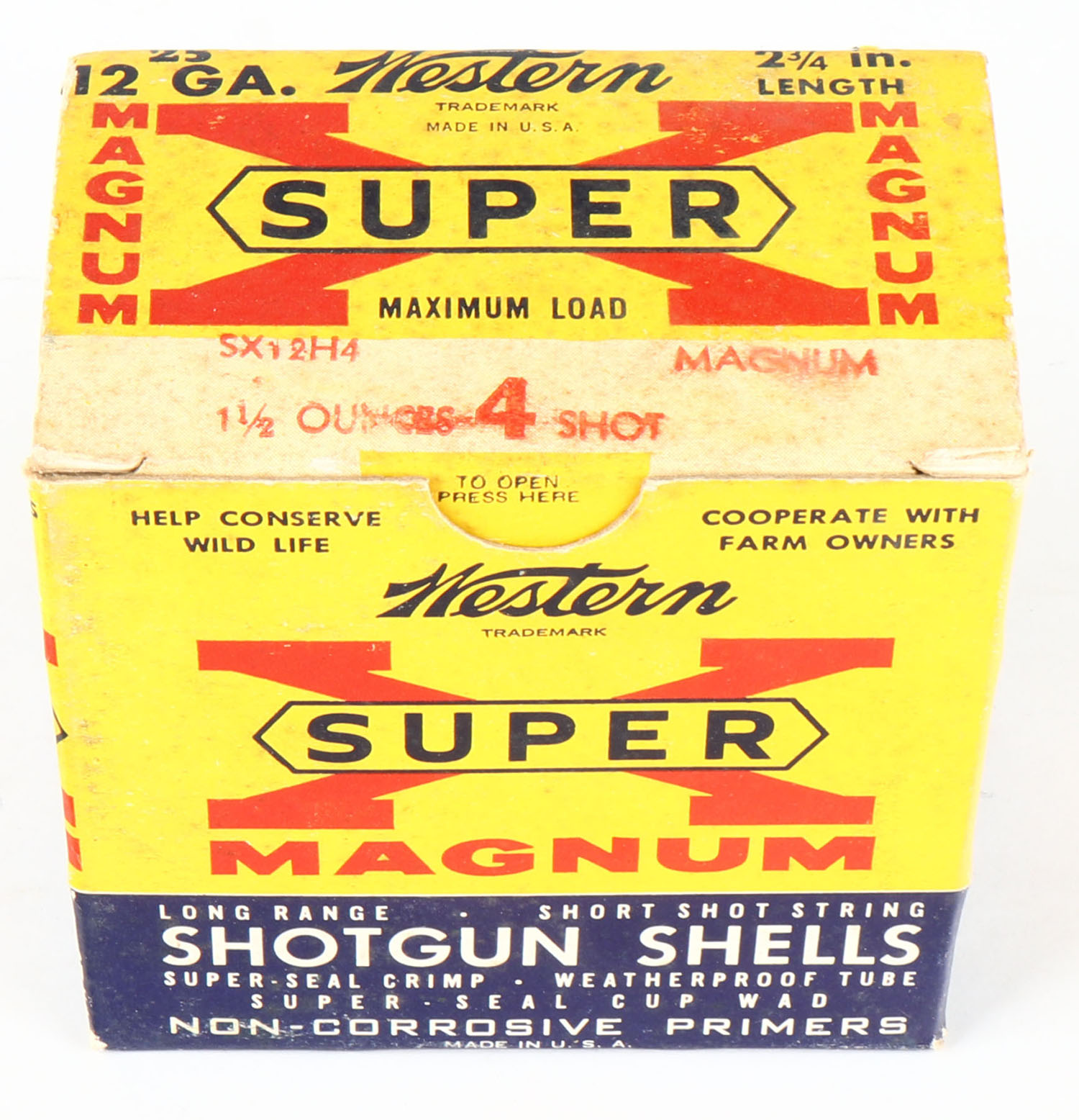 Western, Super X Magnum, with Insert, 12ga., 2 3/4'', 1pc., Full, shot size 4, yellow, blue & red box, box is very solid with light scuffing, paper shells are minty. Grade: Excellent + - Value: 10 to 30