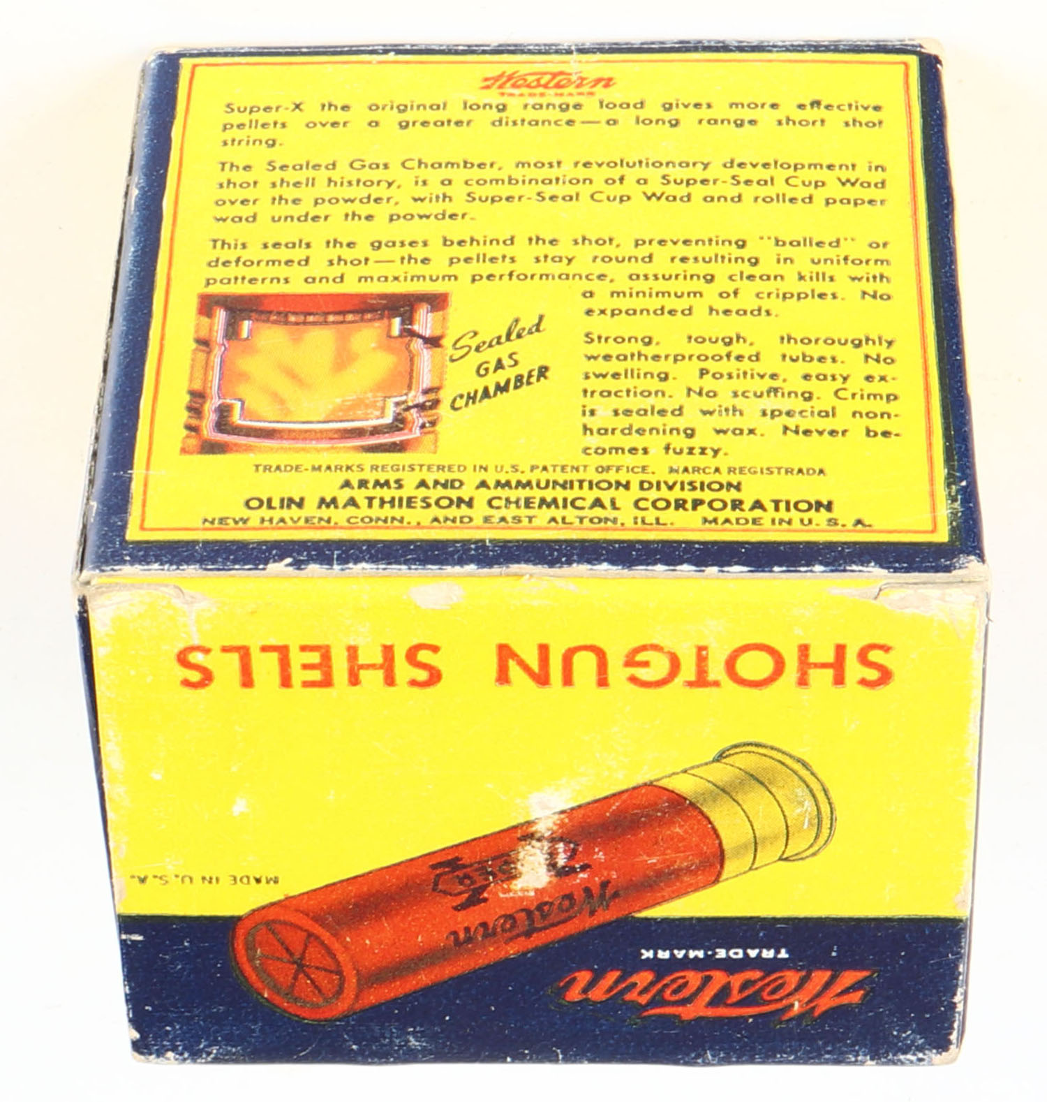 Western, Super X, 28ga., 2 3/4'', 1pc., Partial 20rds., shot size 6, multi-colored box, box is very solid with great colors, paper shells are excellent. Grade: Excellent + - Value: 10 to 30