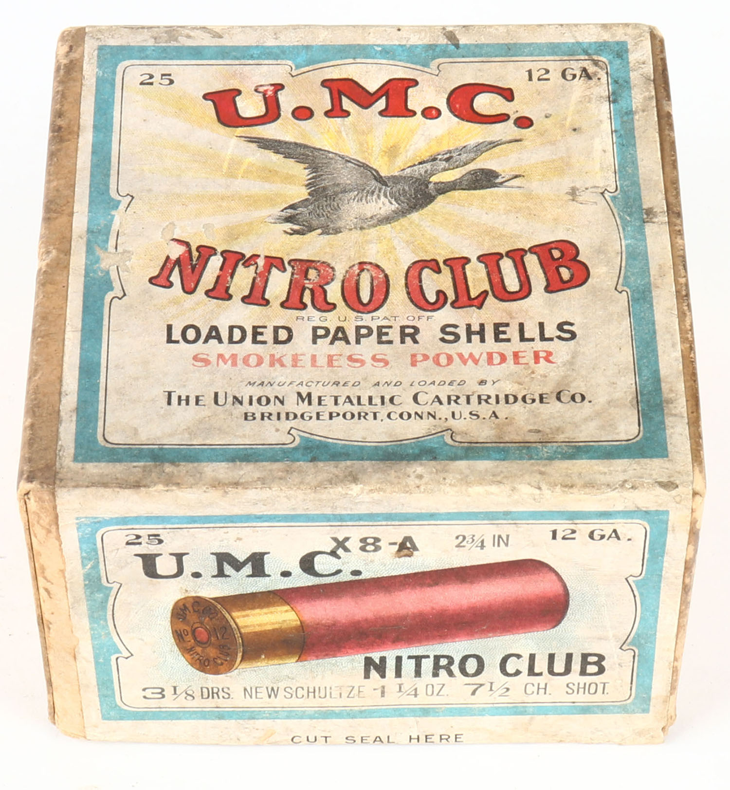 U.M.C. Nitro Club, 12ga., 2pc., Empty, shot size 7 1/2 CH., 3 1/8 Drs., 1 1/4 Oz., buff box with sunburst logo & Mallard flying on top, box has some age soiling & scuffing with writing on bottom. Grade: Very Good + - Value: 50 to 250