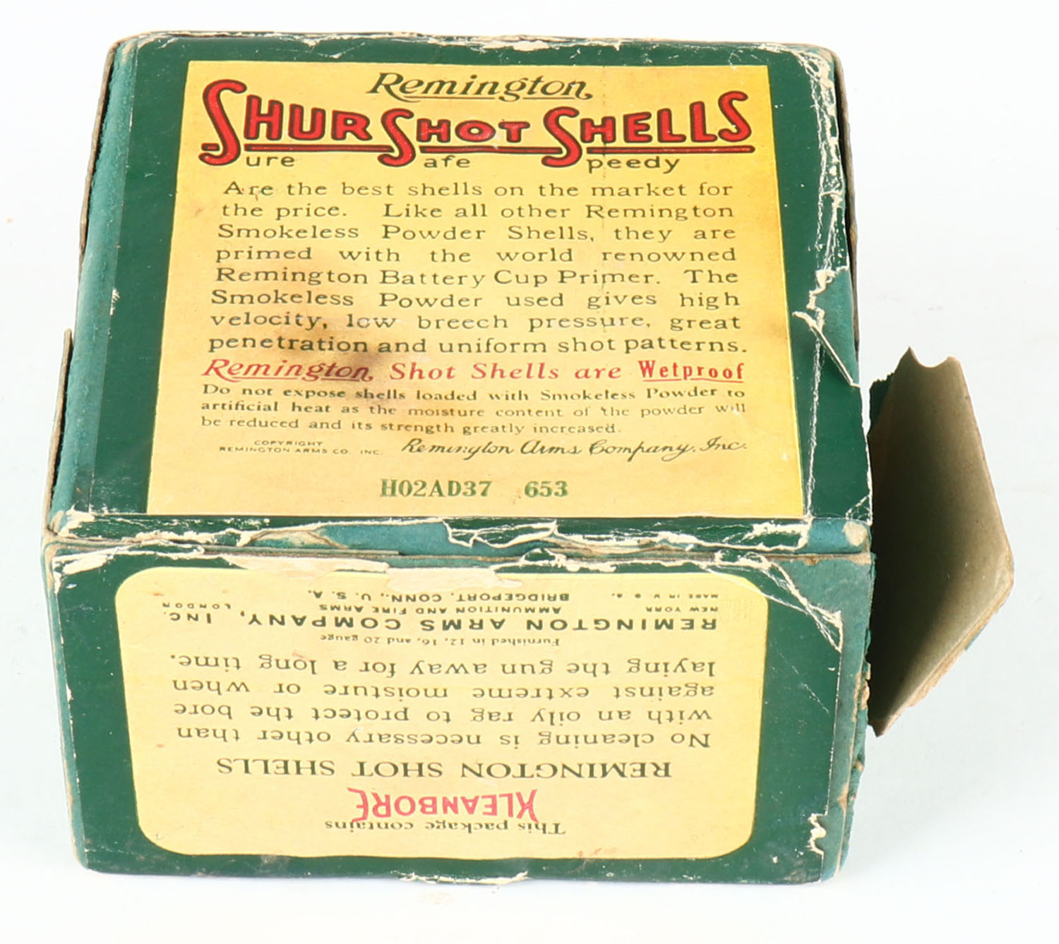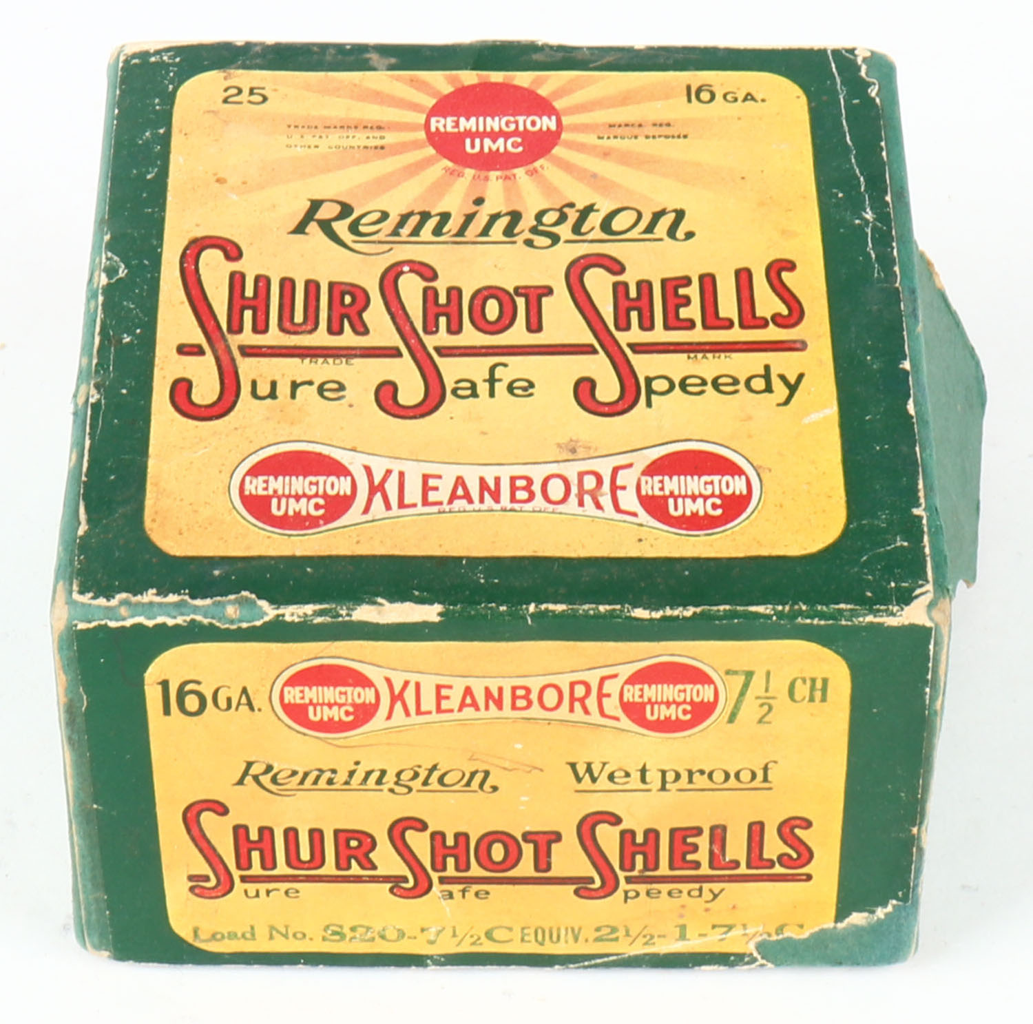 Remington UMC, Shur Shot Shells, 16ga., 2pc., Empty, shot size 7 1/2 CH., green box with green, yellow & red paper label, box has light age soiling with edge & corner wear, has a seam split. Grade: Very Good - Value: 20 to 100