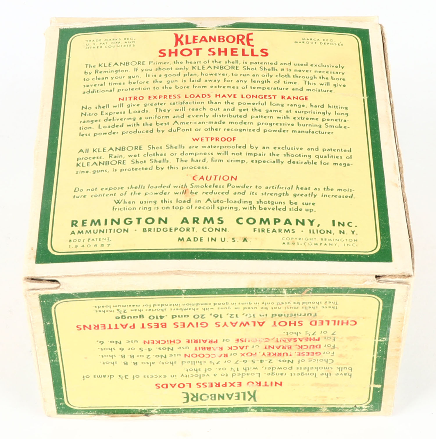 Remington Kleanbore, NITRO EXPRESS, 12ga., 1pc., Partial 20rds., shot size BB, box is buff, yellow, red and green, box is solid with minor scuffing, paper shells are excellent. Grade: Excellent - Value: 20 to 60