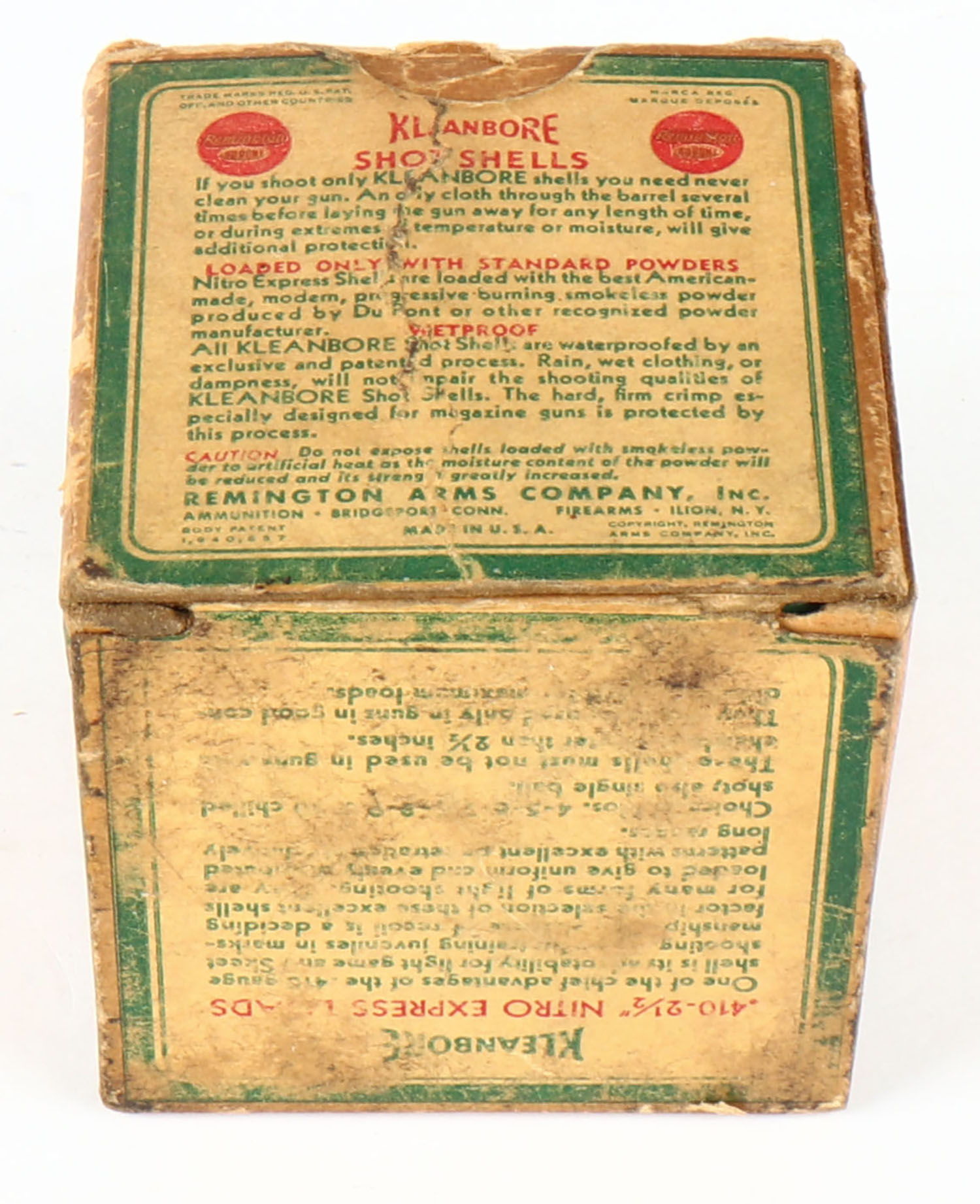Remington, Kleanbore, NITRO EXPRESS, 410ga., 1pc., Partial 22rds. With 5 being correct shot size, shot size 6C, 2 1/2'', box is yellow, red and green, box has age soiling & scuffing, paper shells are good. Grade: Good ++ - Value: 10 to 40