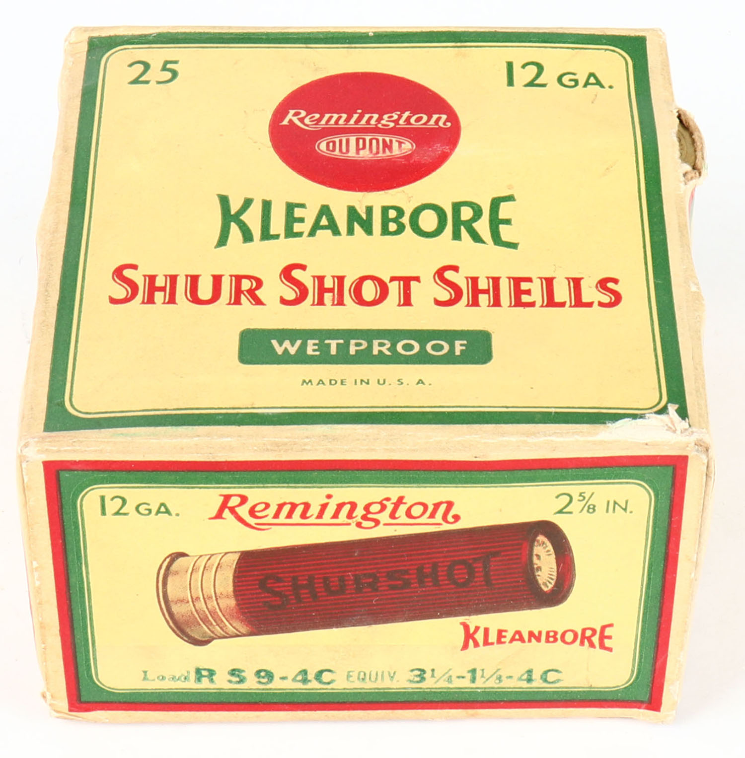Remington Kleanbore, SHUR SHOT SHELLS, 12ga., 1pc., Full, shot size 4C, box is yellow, red and green, box has light shell protrusion with great colors, paper shells are excellent. Grade: Very Good ++ - Value: 10 to 50