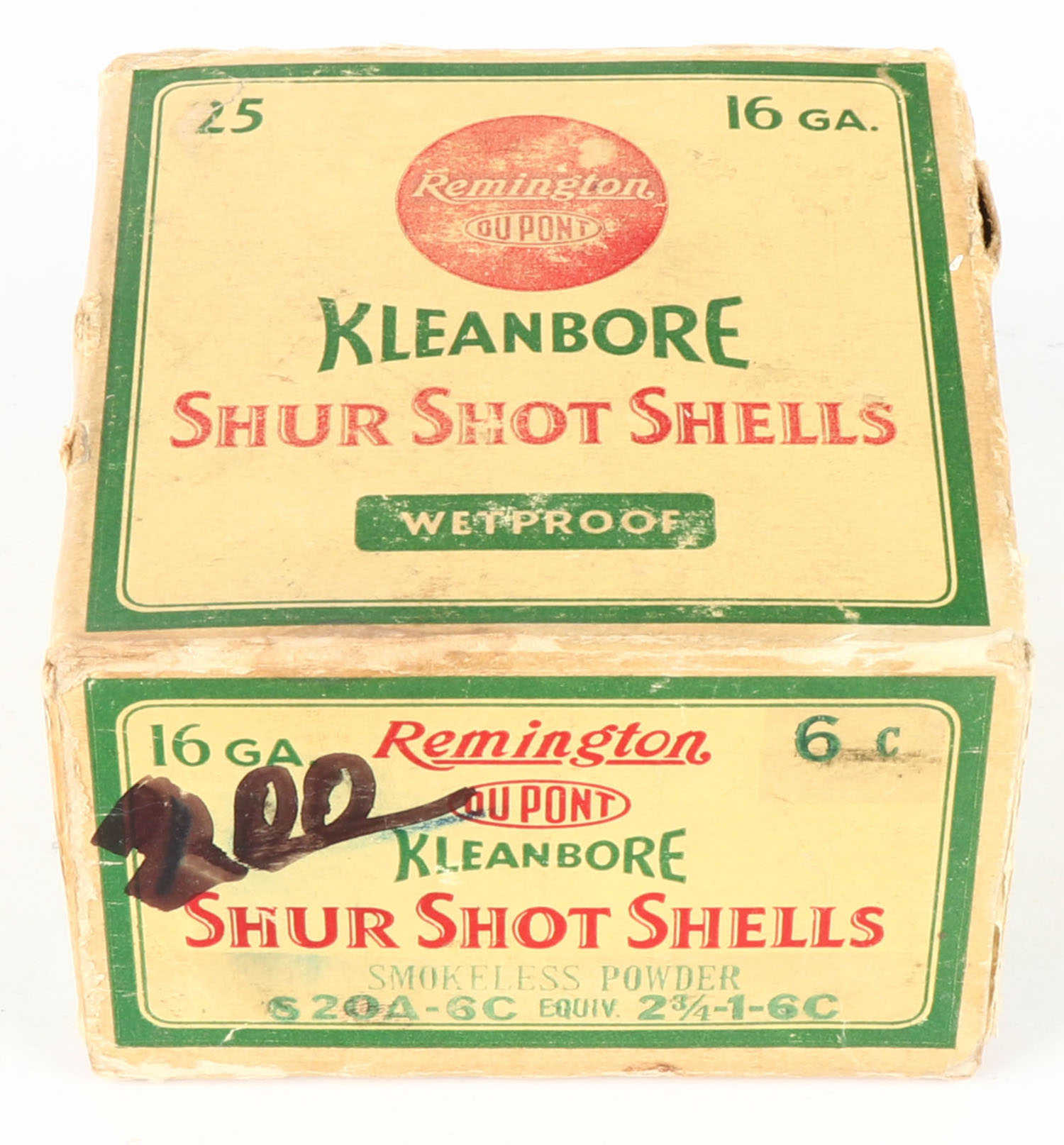 Remington Kleanbore, SHUR SHOT SHELLS, 16ga., 1pc., Full, shot size 6C, box is yellow, red and green, box has age soiling & edge wear, paper shells are very good. Grade: Very Good - Value: 20 to 60
