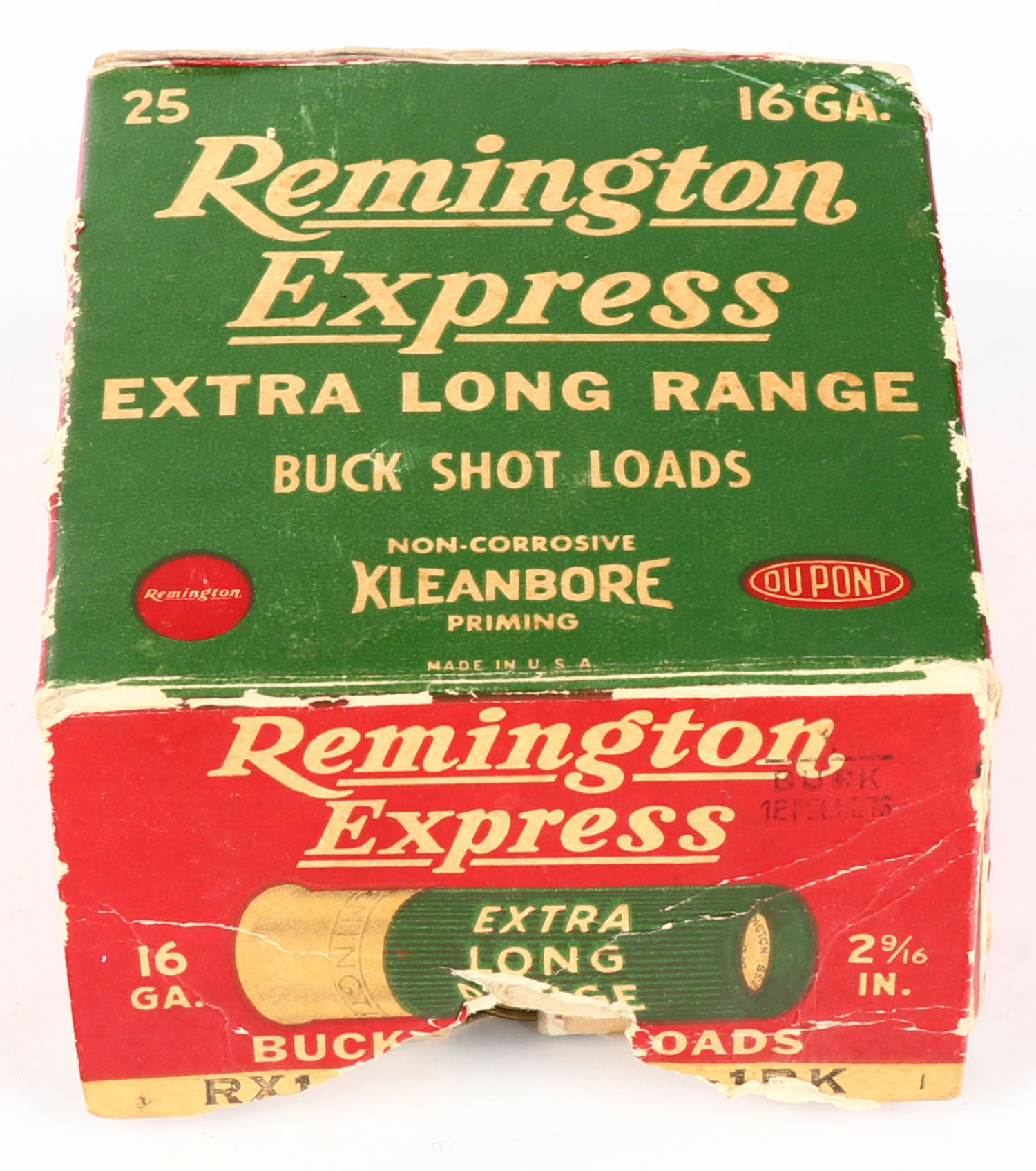 Remington Express, Extra Long Range, 16ga., 2 9/16'', 1pc., Full, shot size 1 Buck, box is red, green, and yellow, box has partially torn bottom flap, paper shells are very good. Grade: Good ++ - Value: 10 to 30