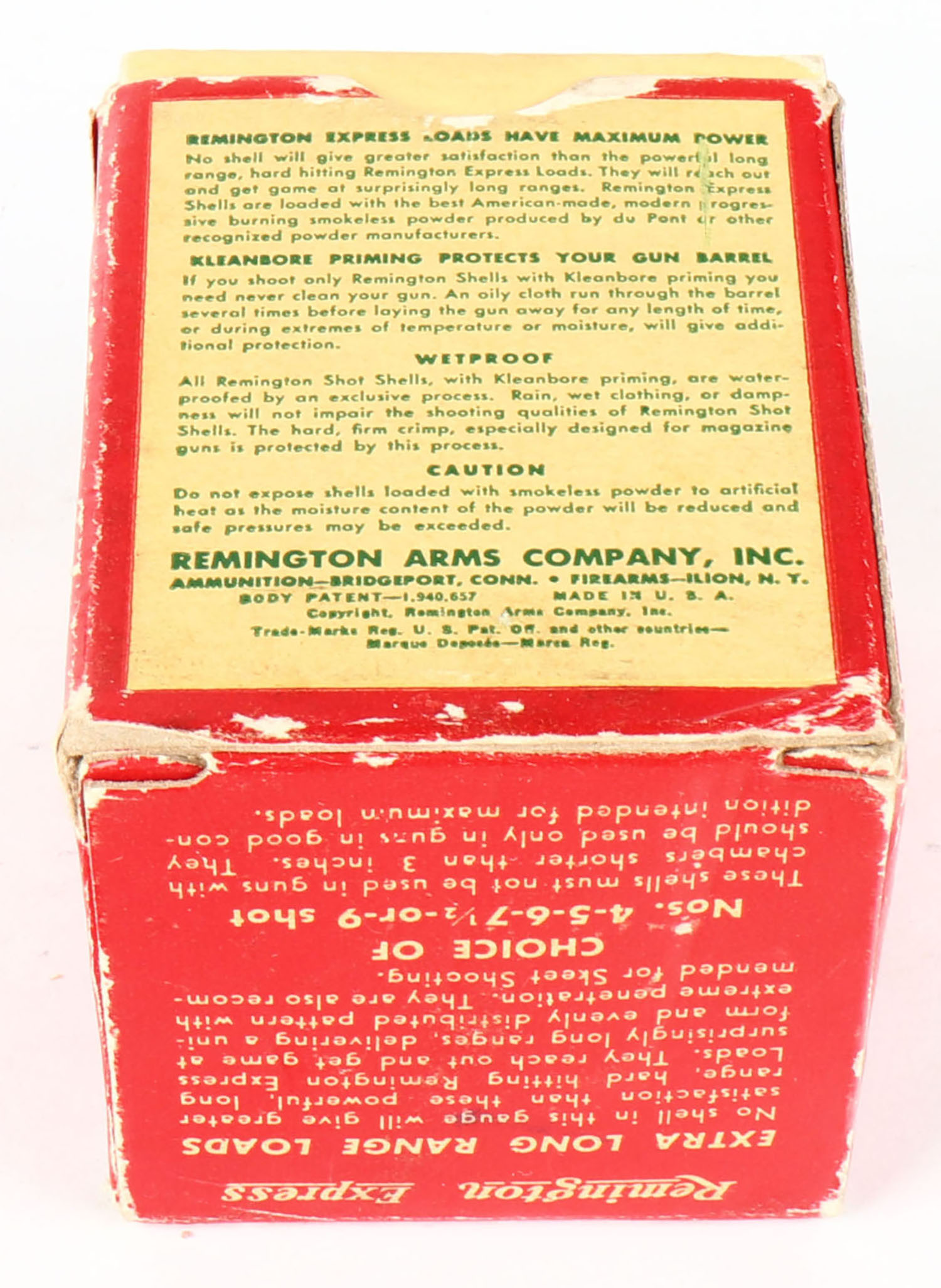 Remington Express, Extra Long Range, 410ga., 3'', 1pc., Full, shot size 4, box is white, yellow, red and green, box is very solid with light edge wear, paper shells are excellent. Grade: Excellent - Value: 10 to 50