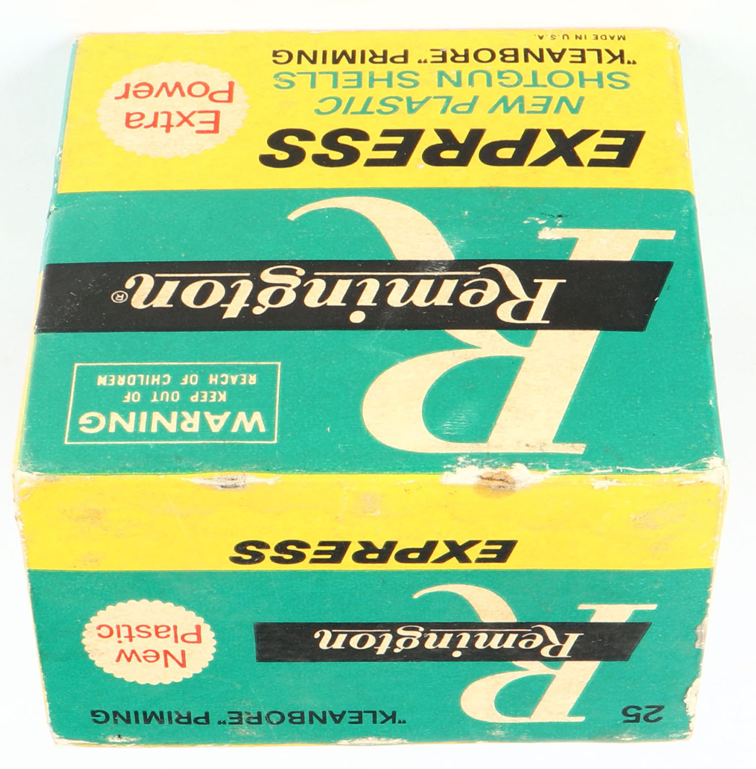 Remington, Express, 12ga., 1pc., Full, shot size 7 1/2, multi-colored box, box is solid with some scuffing, plastic shells are very good. Grade: Very Good + - Value: 10 to 40