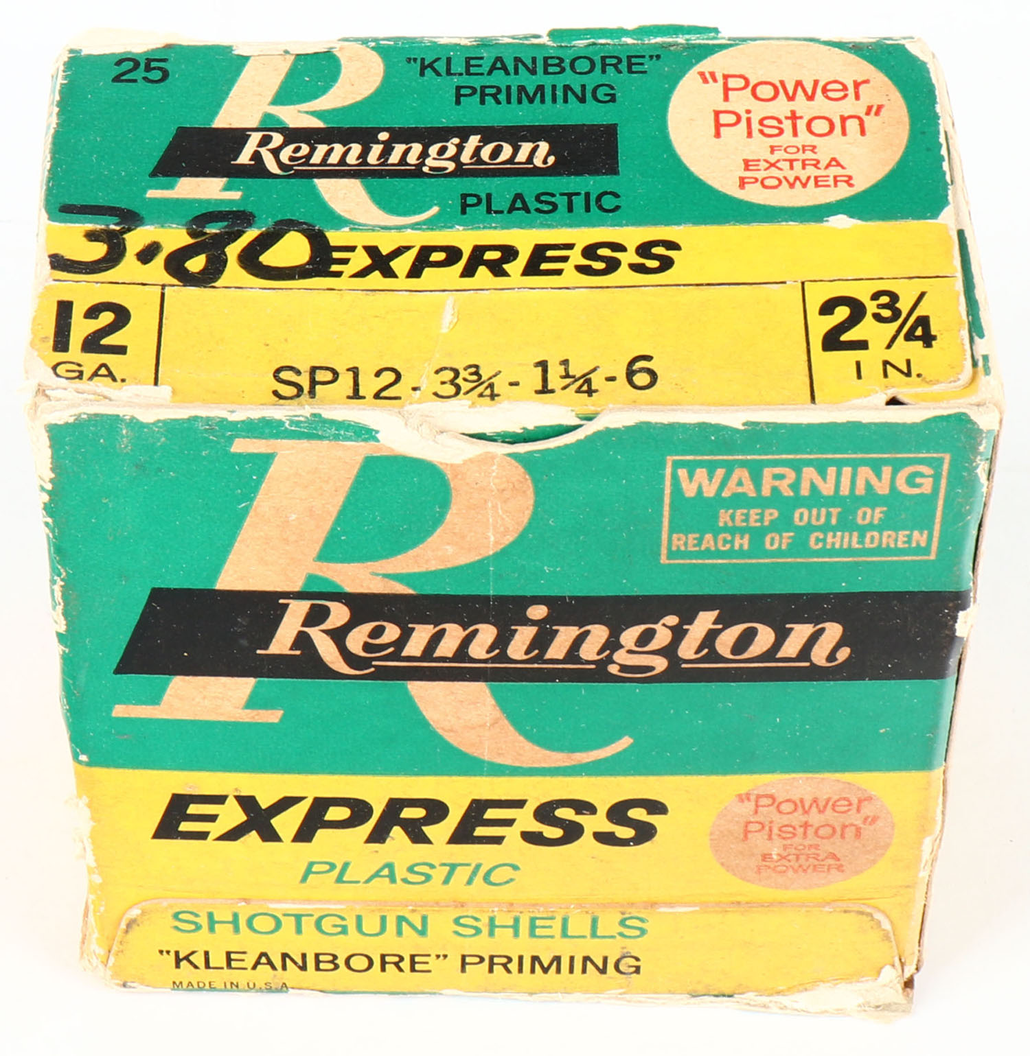 Remington, Express, 12ga., 1pc., Full, shot size 6, multi-colored box, box has a seam split with edge wear, plastic shells are very good. Grade: Good ++ - Value: 10 to 40