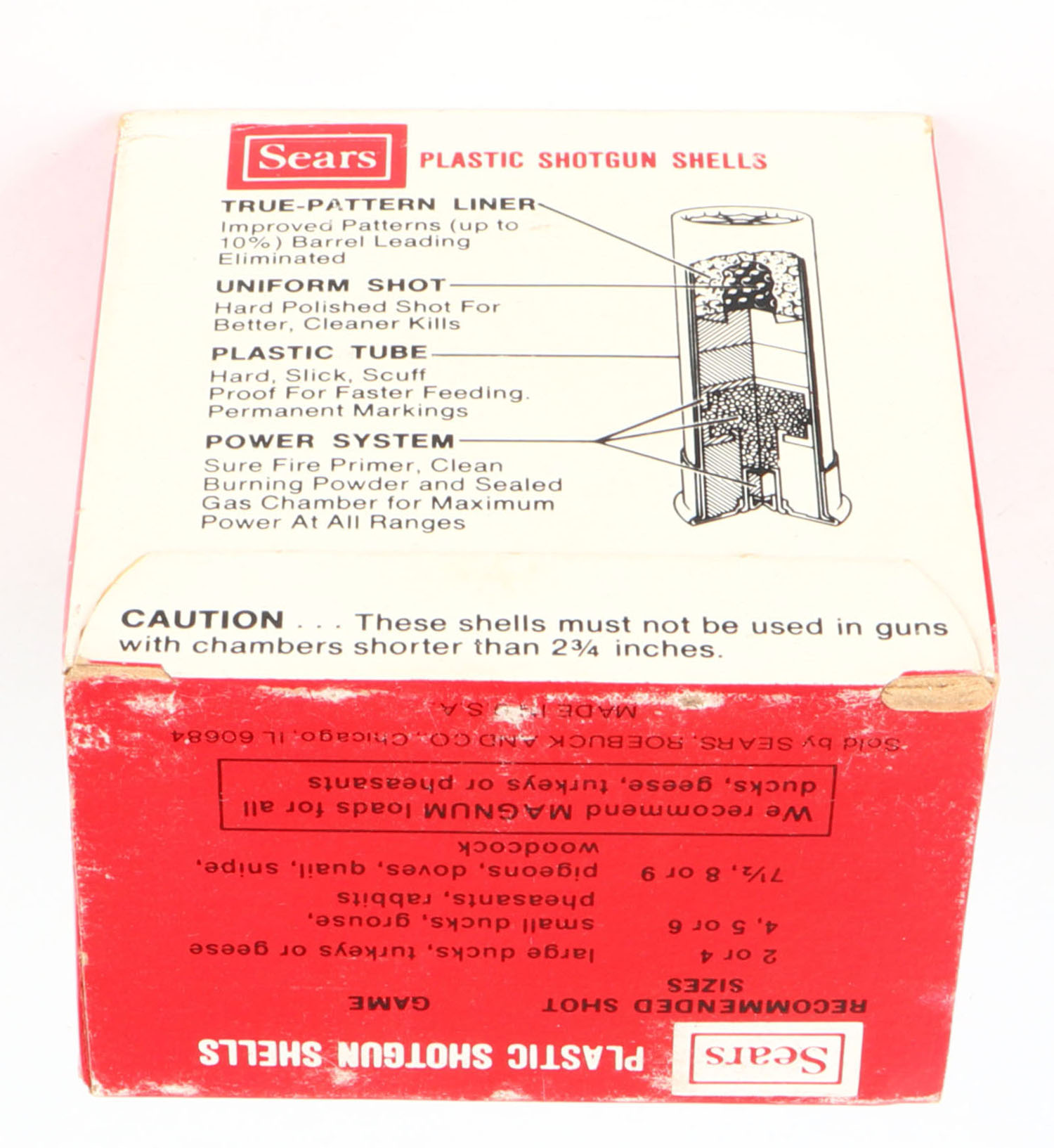 Sears, Light Field Load, 20ga., 1pc., 2 3/4'', shot size 6, multi-color box, box is very solid, plastic shells are excellent. Grade: Excellent - Value: 10 to 40
