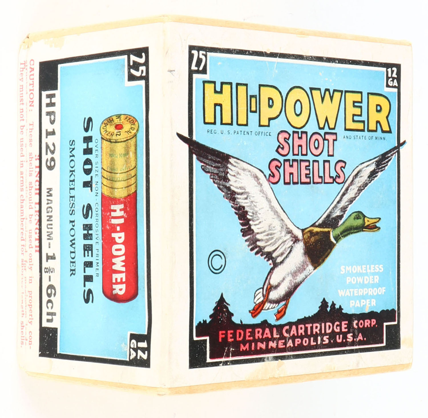 Federal Cart. Co., HI-POWER, 12ga., 2 PIECE!, FULL & SEALED, Loading: Magnum 3''- 1 5/8- 6CH Shot, buff box with multi colored label that pictures Mallard in flight, box is very solid with very nice label. Grade: Excellent + - Value: 100 to 300