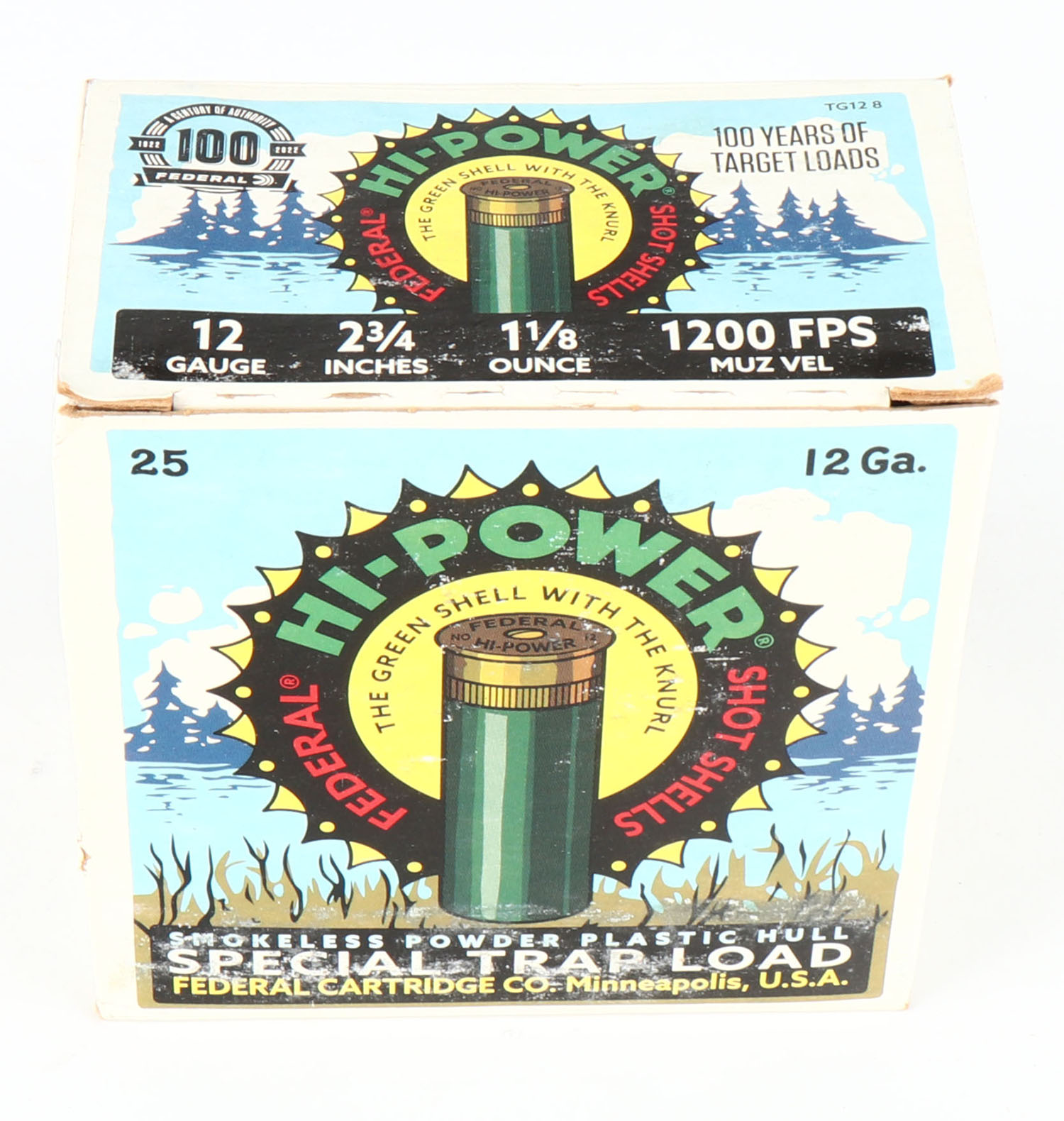 Federal Cart. Co., HI-POWER 100 Year Anniversary, 12ga., 2 3/4'', 1pc., Full, shot size 8 Special Trap Load, multi-colored box with Original Hi-Power Design, box is very solid with Minty color box shows earlier boxes & when they were introduced also tells little story about Federal, shells are Minty. Grade: Excellent ++ - Value: 20 to 80