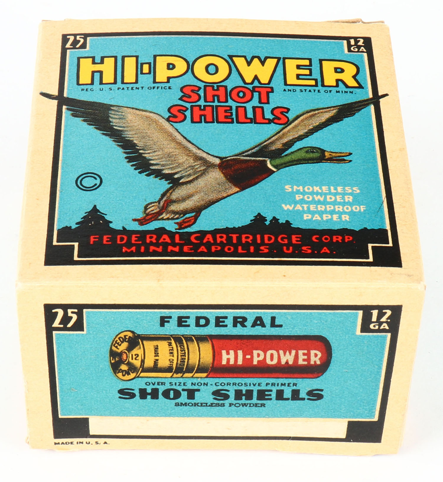 Federal Cart. Co., HI-POWER, 12ga., 1pc., Empty, shot size unknown, Black border, blue, yellow and red box with flying mallard, box is very solid with minty colors. Grade: MINT - Value: 10 to 60
