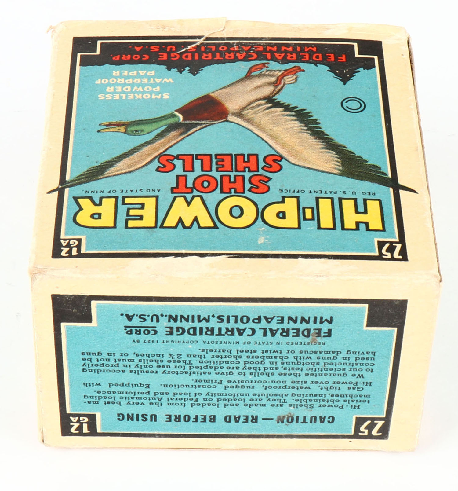Federal Cart. Co., HI-POWER, 12ga., 1pc., Empty, shot size 4CH, Black border, blue, yellow and red box with flying mallard, box is very solid with excellent colors. Grade: Excellent - Value: 10 to 40