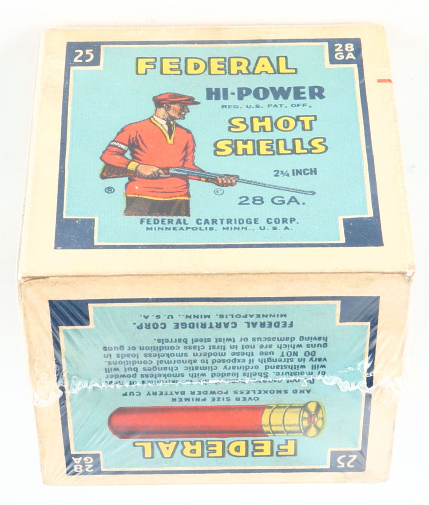 Federal Cart. Co., HI-POWER, 28ga., 1pc., Empty, shot size 9 Target Load, Blue border, blue, yellow and red box with trap shooter, box is very solid with excellent color. Grade: MINT - Value: 20 to 80