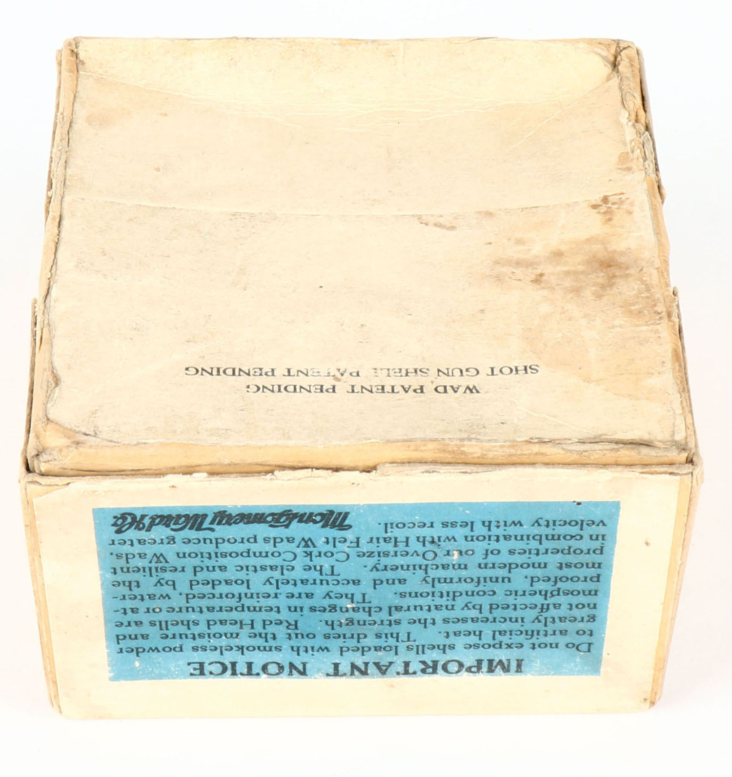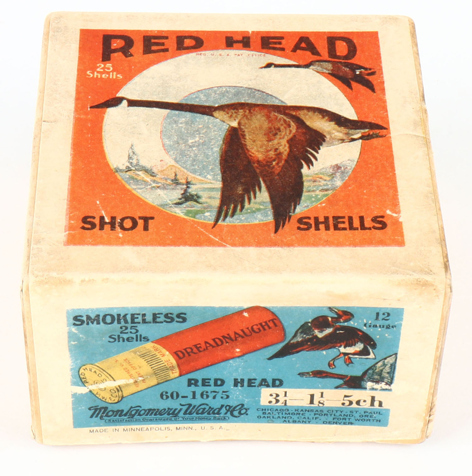 Montgomery Ward & Co., Red Head, Dreadnaught, Has Early Side label, 12ga., 2pc., Empty, shot size 5ch, buff box with multi colored scene & two geese flying, box has light scuffing & light soiling with great colors. Grade: Excellent - Value: 100 to 200