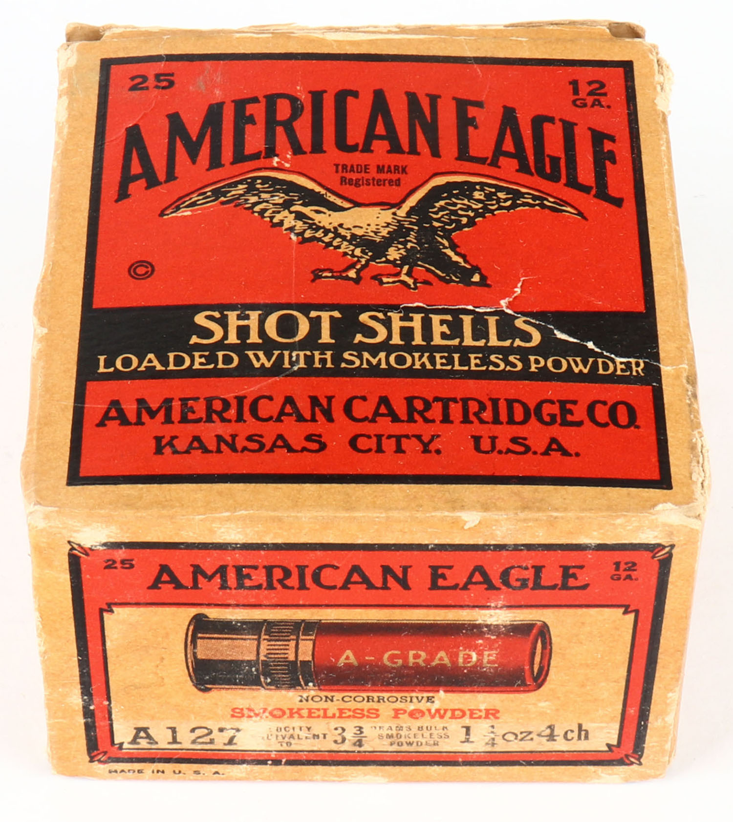 American Cart. Co., A-Grade, 12ga., 1pc., Partial 18rds., shot size 4Ch, buff, red & black box that pictures a flying eagle, box has some age soiling with edge wear, has a slight seam split, paper shells are very good. Grade: Good ++ - Value: 20 to 100