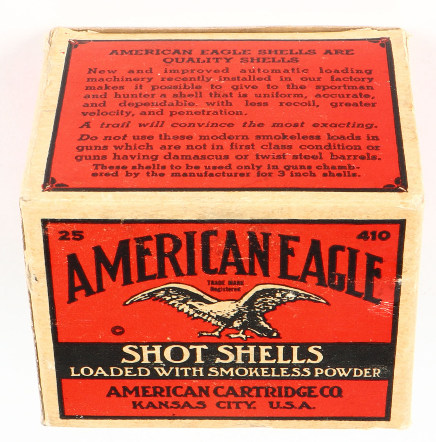 American Cart., Co., ''A'' Grade, 410ga., With Insert, 1pc., Partial 24rds., shot size 7 1/2ch, buff, red & black box that pictures a flying eagle, box is very solid with excellent colors, paper shells are excellent. Grade: Excellent + - Value: 40 to 200