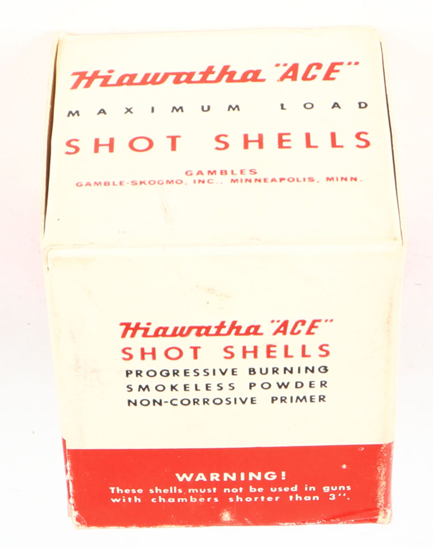 Gambles, Hiawatha ''ACE'', 410ga., 1pc., Full, 3'', shot size 7 1/2, white, red & black box, box is very solid with minor scuffing, plastic shells are excellent. Grade: Excellent - Value: 10 to 30