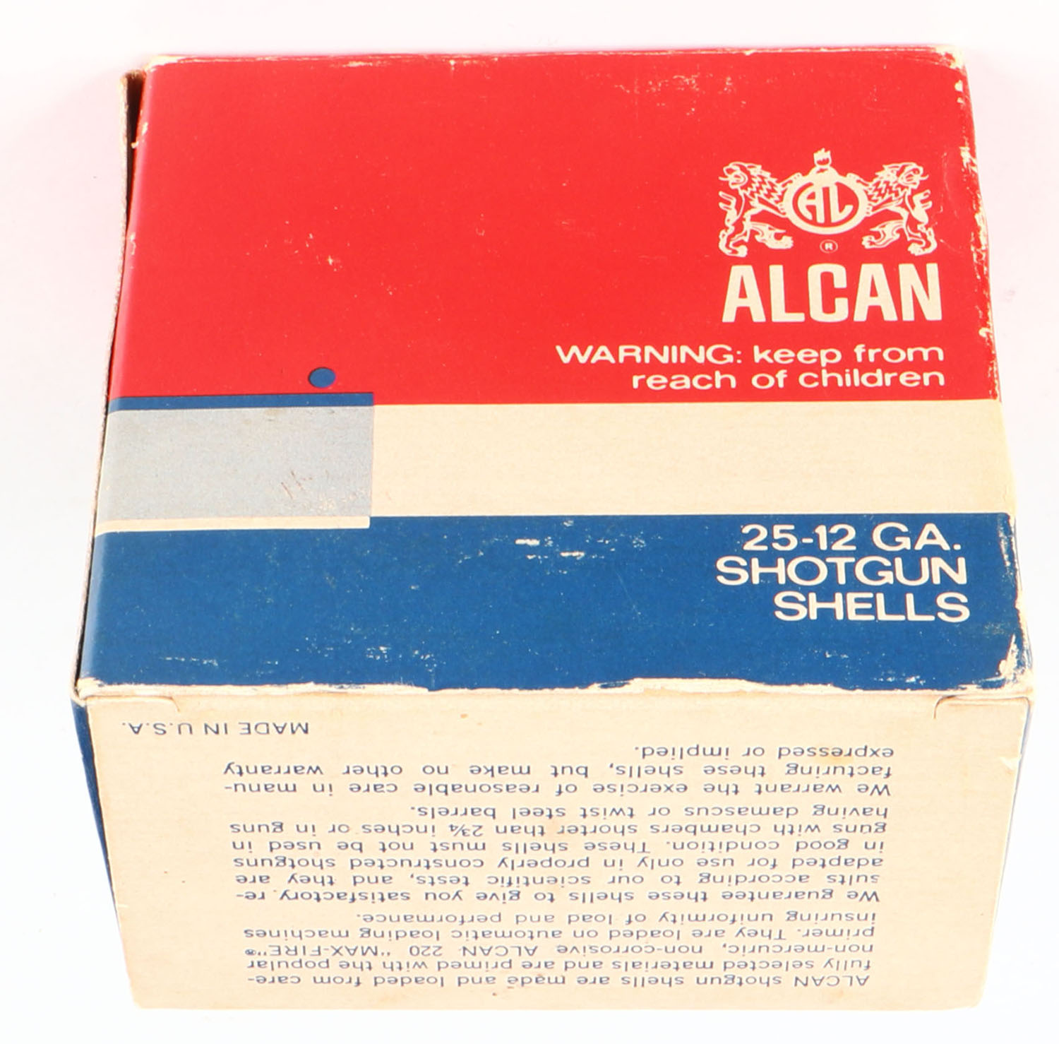 Alcan, Gamemax Smokeless Powder, 12ga., 1pc., Full, shot size 8, multi-colored box, box has some age soiling & edge wear, plastic shells are very good. Grade: Very Good - Value: 10 to 40