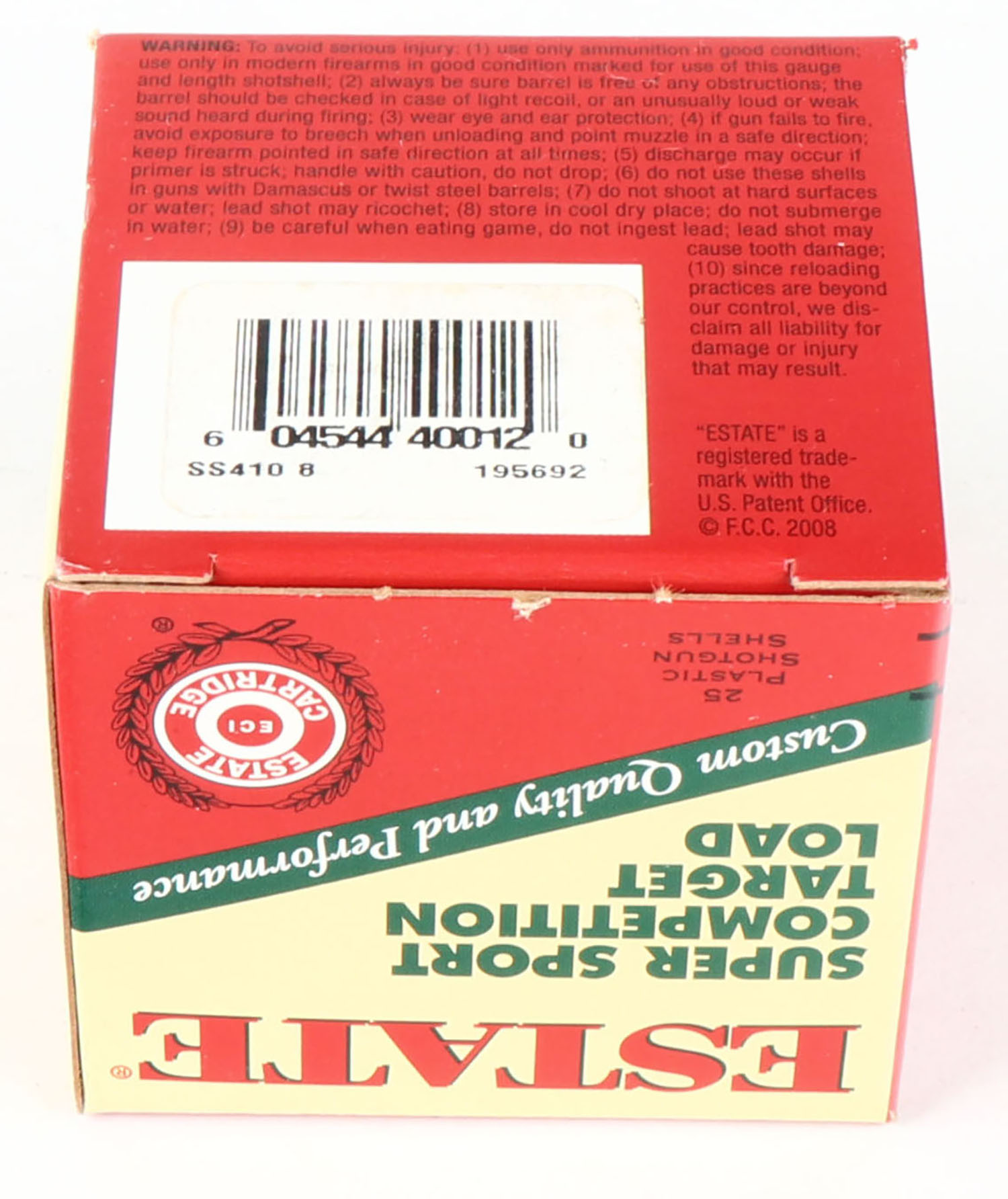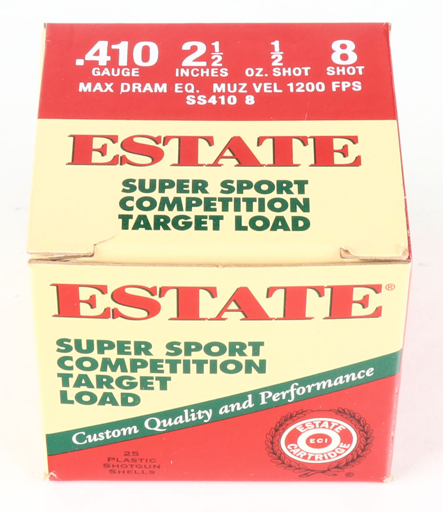 Estate, 410ga., 1pc., Full, shot size 8, box is very solid with excellent colors, plastic shells are minty. Grade: Excellent ++ - Value: 10 to 40