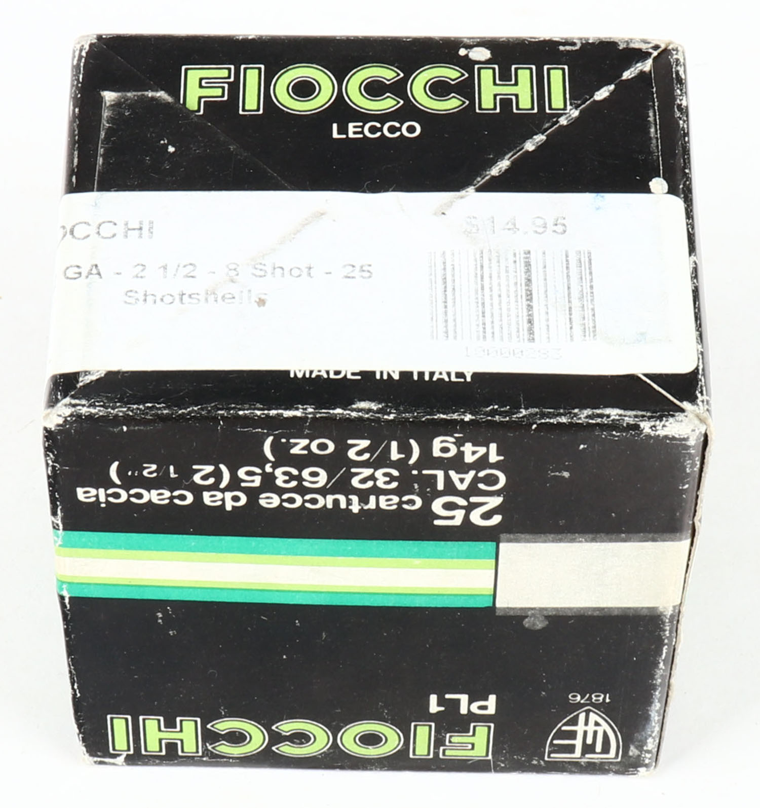Fiocchi, 32ga., 1pc., Full, 2 1/2'', shot size 8, multi-colored box, box has light age soiling with some edge wear, plastic shells are very good. Grade: Very Good + - Value: 20 to 60
