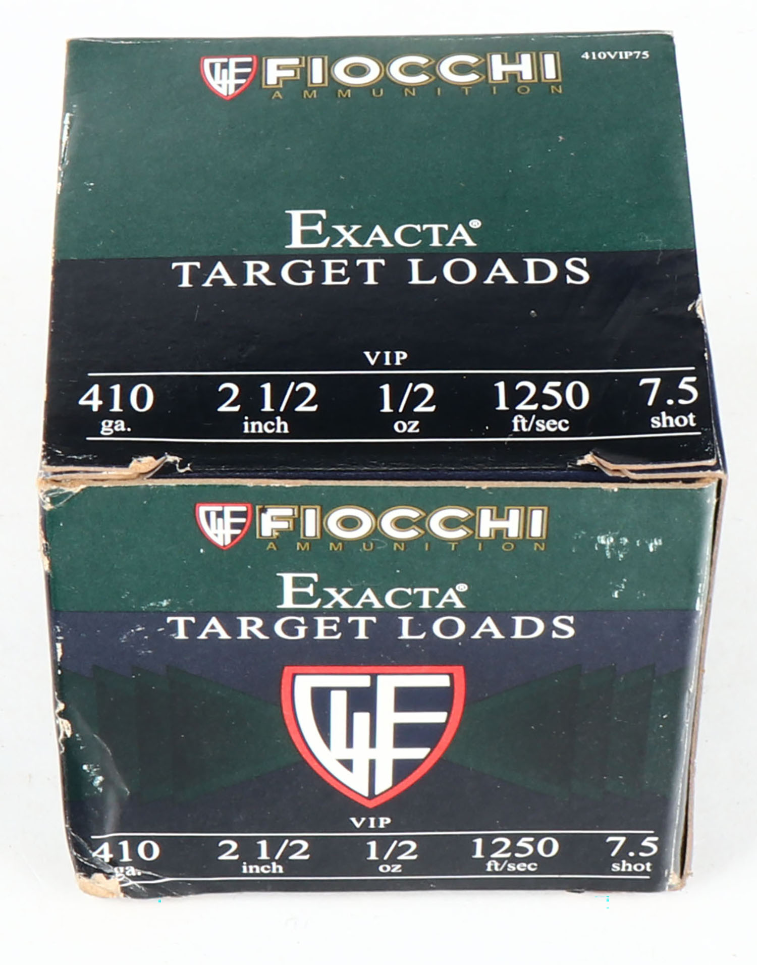 Fiocchi, Exacta Target Loads, 410ga., 1pc., Full, shot size 7 1/2, multi-colored box, box has some edge wear, plastic shells are excellent. Grade: Very Good + - Value: 10 to 30