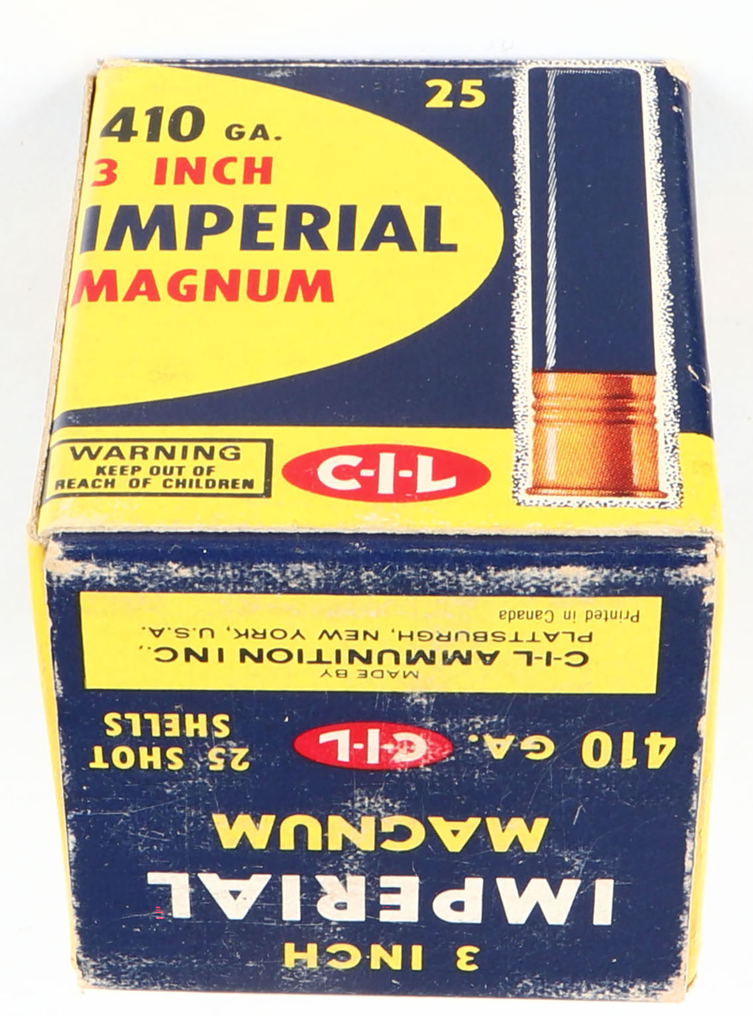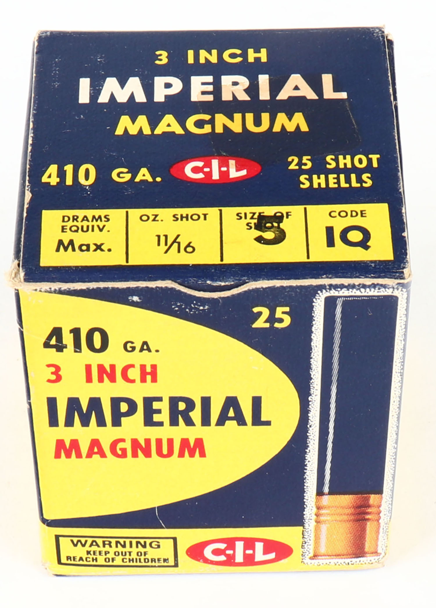 CIL, Imperial Magnum, 410ga., 1pc., 3'', Partial 20rds., shot size 5, multi-colored box, box is solid with very nice colors, paper shells are good. Grade: Very Good - Value: 20 to 60