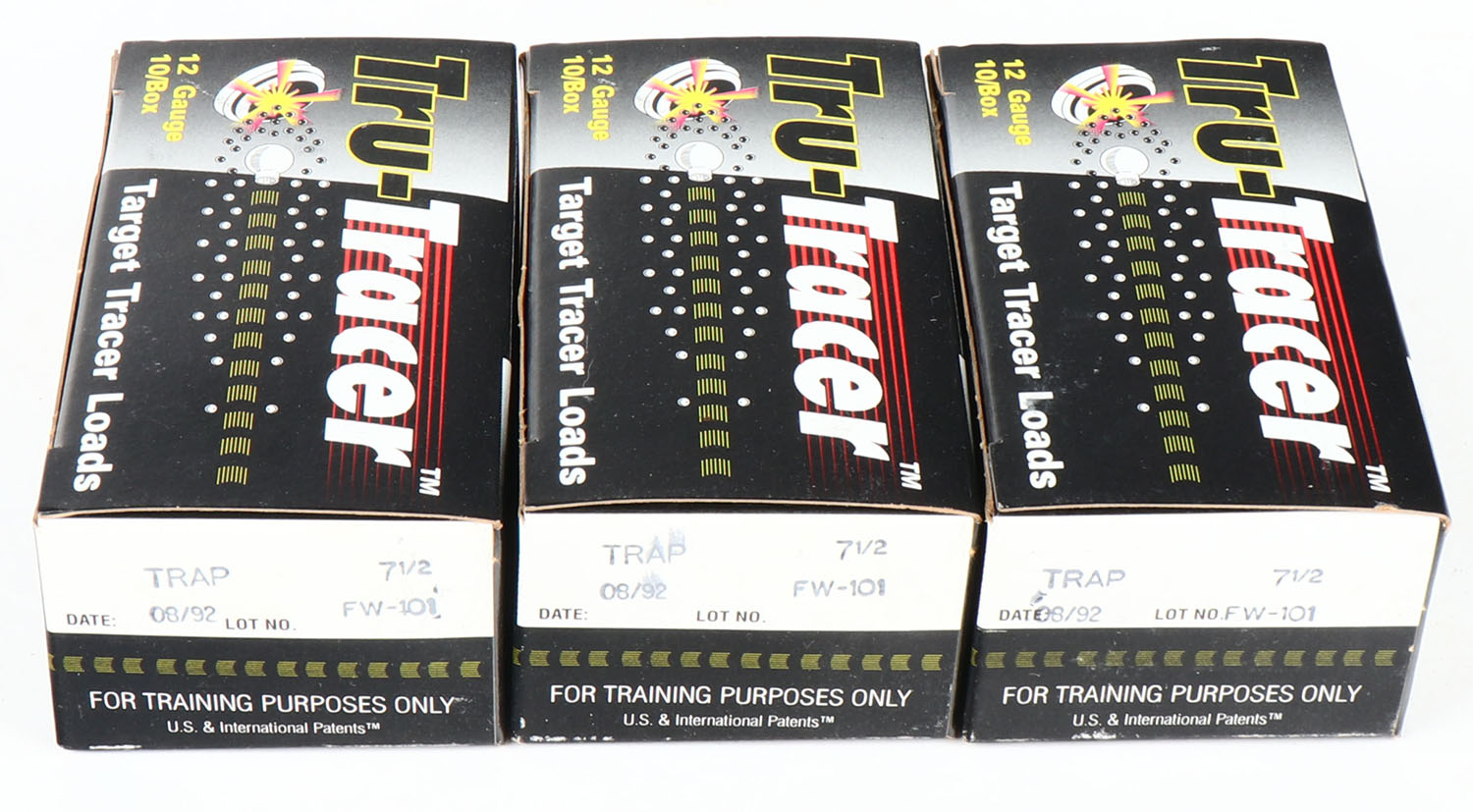 Lot of 3 Tru-Tracer, 12ga., 1pc., Appears Full, shot size 7 1/2, multi-colored boxes. Grade: Excellent + - Value: 10 to 40