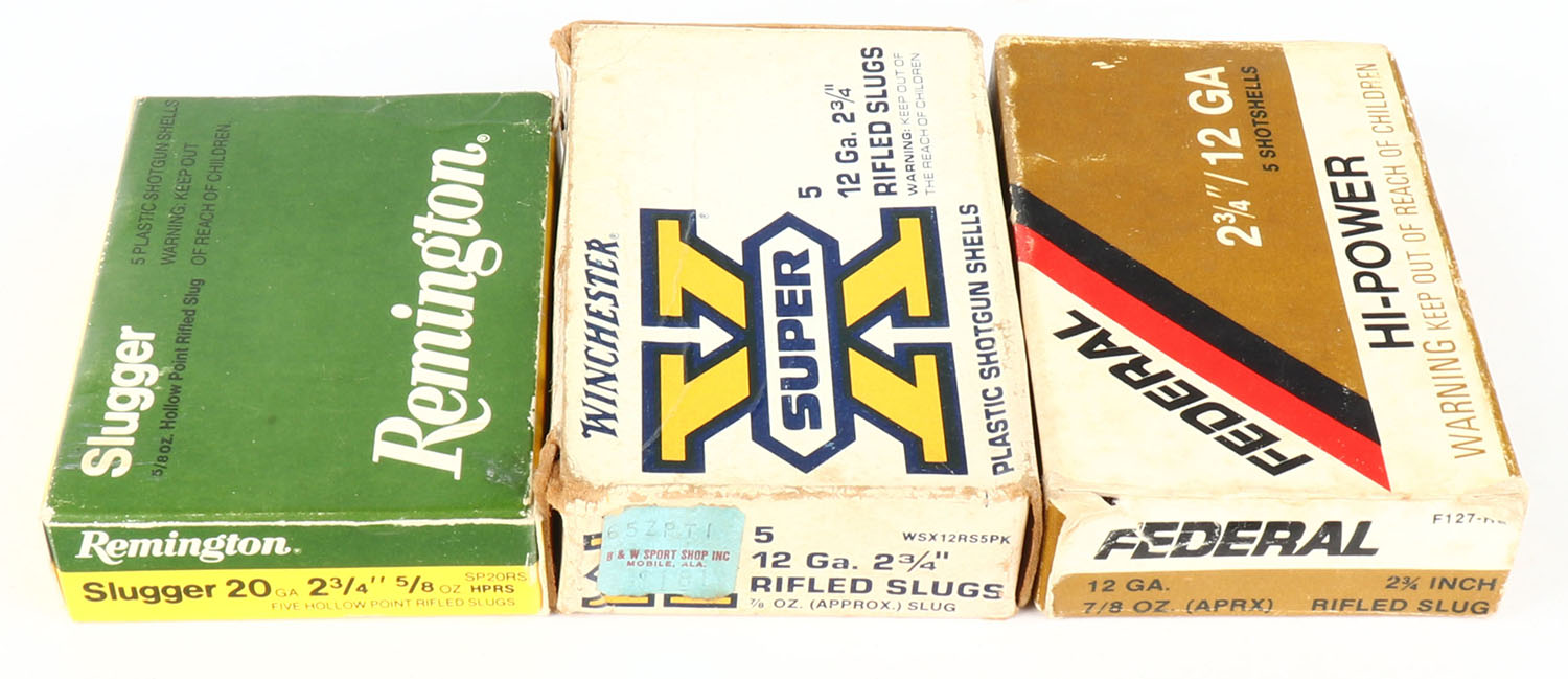 Lot of 3 Mixed Manufacture, 12 & 20ga., Appears Full, shot size Rifled Slugs, Shotshell boxes. Grade: Very Good - Value: 10 to 30