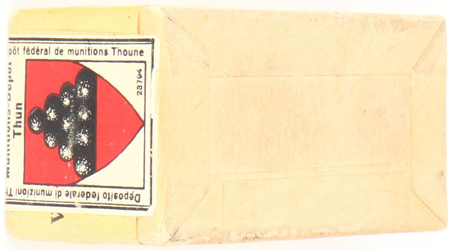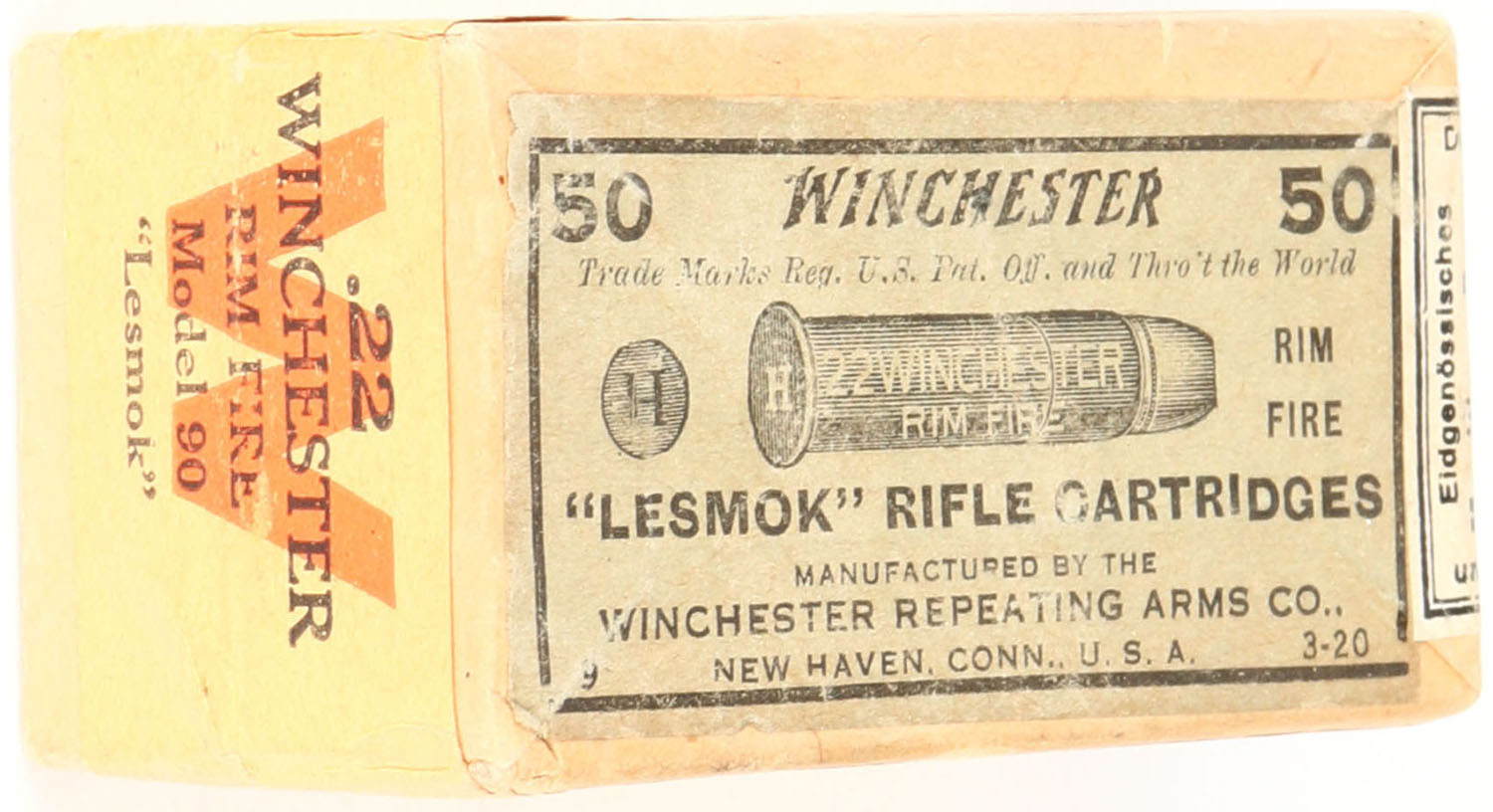 Winchester, ''Lesmok'' Rifle Cartridges, .22 Winchester Rim Fire, RR: WRA-159 WRF-32c, FULL & SEALED, 2pc. Buff box with green top & yellow side sealing labels, Swiss tax stamp on right end, box is solid with excellent color, minor shelf wear & color fading, corner ding on top front corner, corners otherwise sharp, edges are crisp, labels are intact. Grade: Excellent - Value: 40 to 60