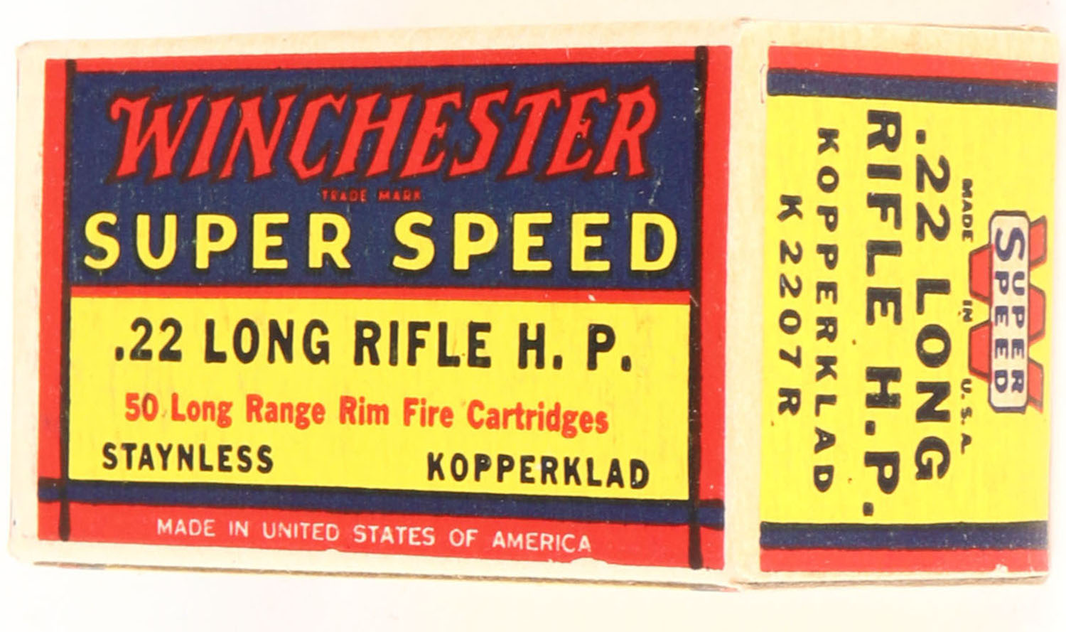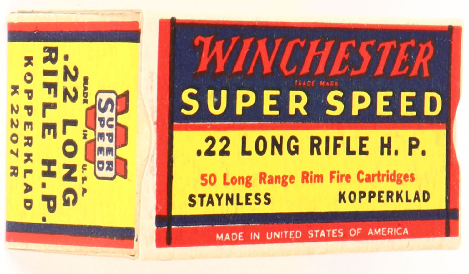 Winchester, Super Speed, .22 Long Rifle Hollow Point, Staynless Kopperklad, RHWeb: WRA-16 LR-2b, Full, 1pc. Yellow blue & red box, box is solid with excellent color, corners are mostly sharp, edges are crisp, end flaps are solid, ammo is excellent. Grade: Excellent + - Value: 40 to 70
