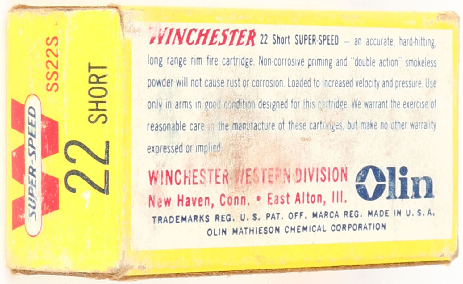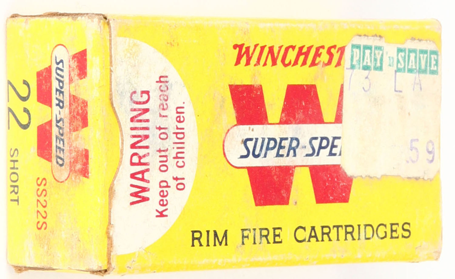 Winchester, Super Speed, .22 Short, 29 Gr. Kopperklad Bullet, RHWeb: WRA-20 S-2, Full, 1pc. Yellow red & white box, box is solid with very good color, some shelf wear, minor corner wear, edges are crisp, end flaps are solid, ammo is minty. Grade: Very Good ++ - Value: 8 to 12
