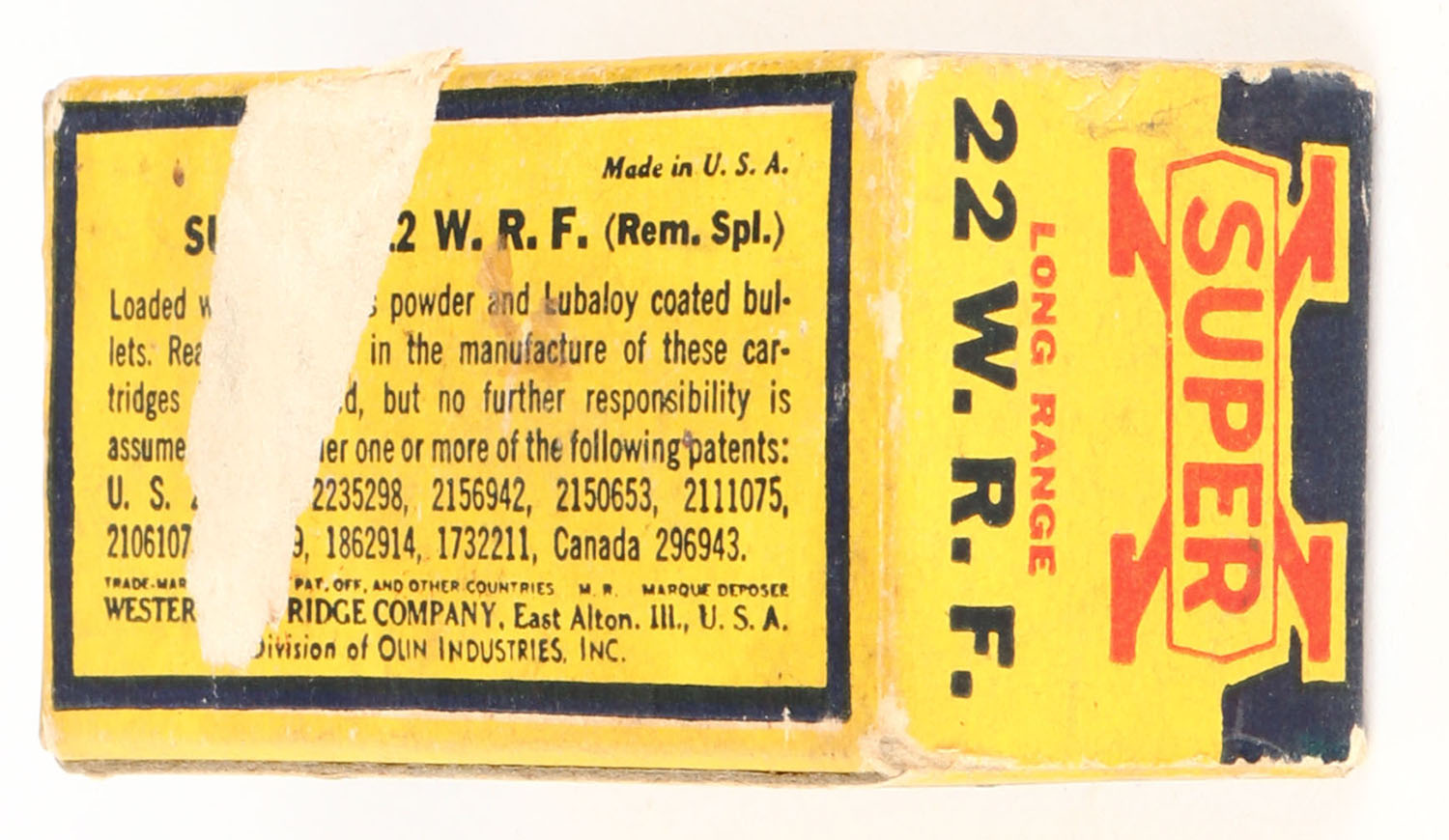 Western, Super-X, .22 W.R.F. (Rem. Spl.), RHWeb: WCC-Super-X-W.R.F WRF-13, Full, 1pc. Yellow blue & red box, box is solid with very good color, some age soiling & corner wear, edges are mostly crisp, end flaps are solid, ammo is very good. Grade: Very Good ++ - Value: 14 to 24