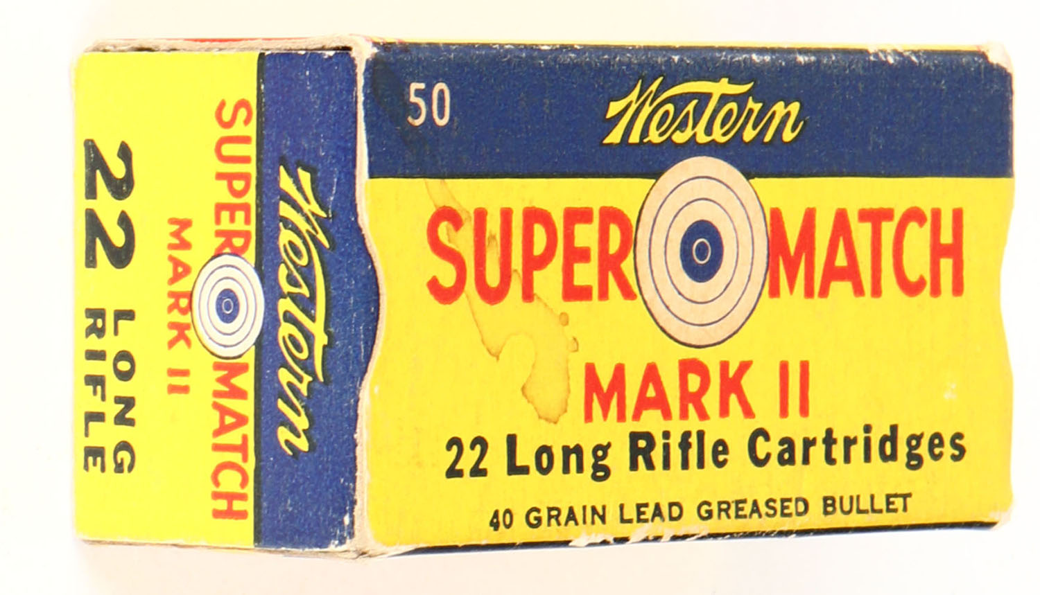 Western, Super Match Mark II, .22 Long Rifle, RHWeb: WCC-51.2 LR-3f, Full, 1pc. Yellow blue & red box, box is solid with excellent color, stain on top, scuff on bottom, minor edge & corner wear, end flaps are solid, ammo is very good. Grade: Very Good ++ - Value: 16 to 24