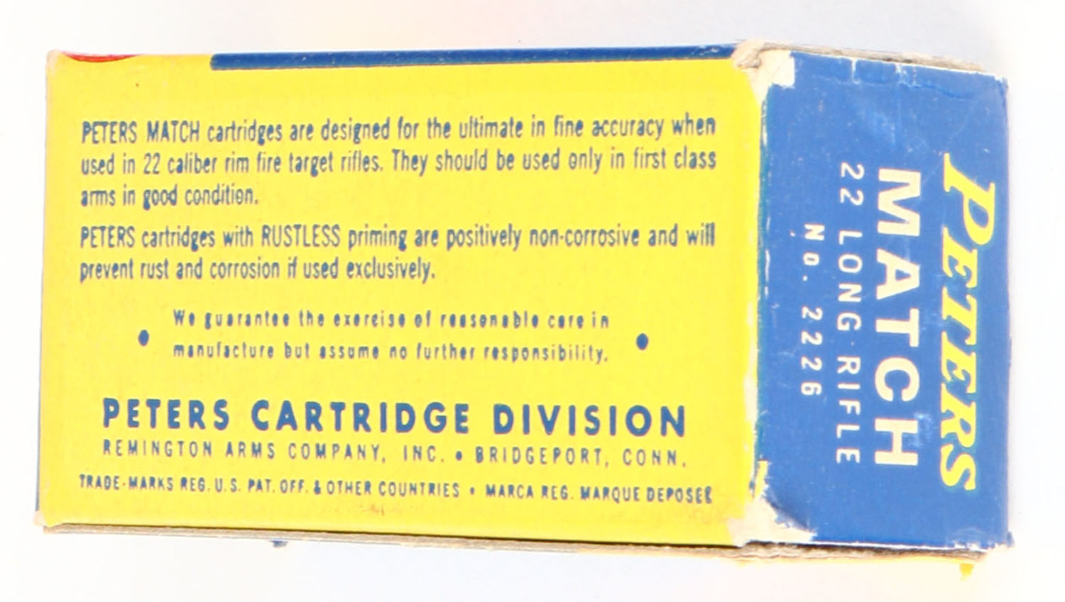 Peters, Match, .22 Long Rifle, For Rifle Shooting, RHWeb: PCC-55 LR-1d, Full, 1pc. Blue yellow & red box, box is solid with excellent color, corner ding on top front corner, corners otherwise mostly sharp, edges are crisp, end flaps are solid, ammo is excellent. Grade: Excellent - Value: 32 to 48