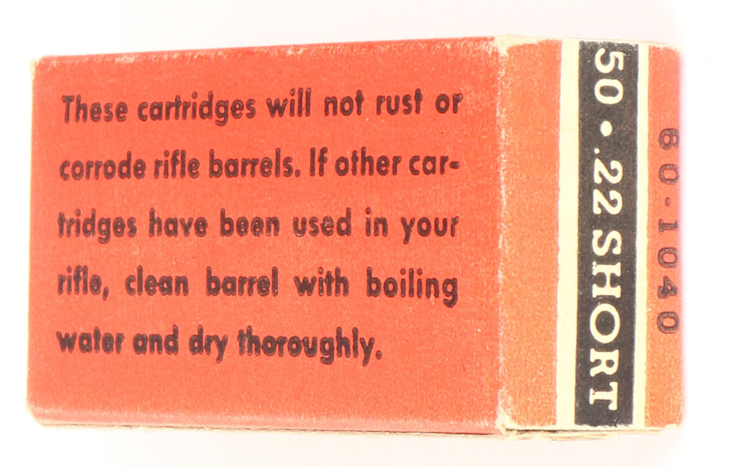Wards, Long Range Cleanfire, .22 Short, Lead Lubricated, RHWeb: MW-4B S-1e, Partial 49rds., 1pc. Red black & white box, box is solid with very good color, some color fading on top, very minor corner wear, edges are crisp, end flaps are solid, ammo is excellent. Grade: Excellent + - Value: 14 to 22