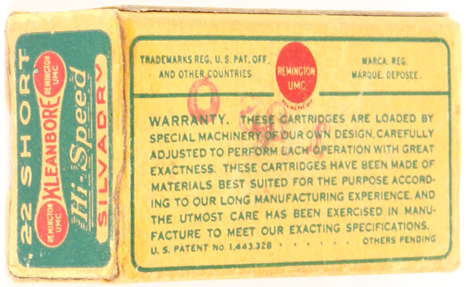 Remington, Silvadry Hi-Speed Kleanbore, .22 Short, RHWeb: REM-7.5 S-1c, Full, 1pc. Green buff & red dog bone box, box is solid with excellent color, minor age soiling, very minor edge & corner wear, end flaps are solid, ammo is excellent. Grade: Excellent - Value: 24 to 36