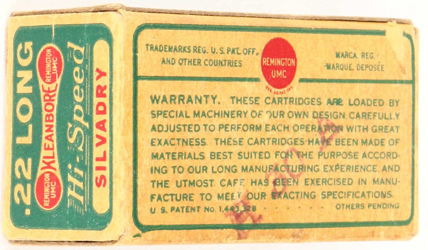 Remington, Silvadry Hi-Speed Kleanbore, .22 Long, RHWeb: REM-7.5 L-1b, Full, 1pc. Green buff & red dog bone box, box is solid with excellent color, very minor shelf & corner wear, edges are mostly crisp, end flaps are solid, ammo is excellent. Grade: Excellent - Value: 70 to 100