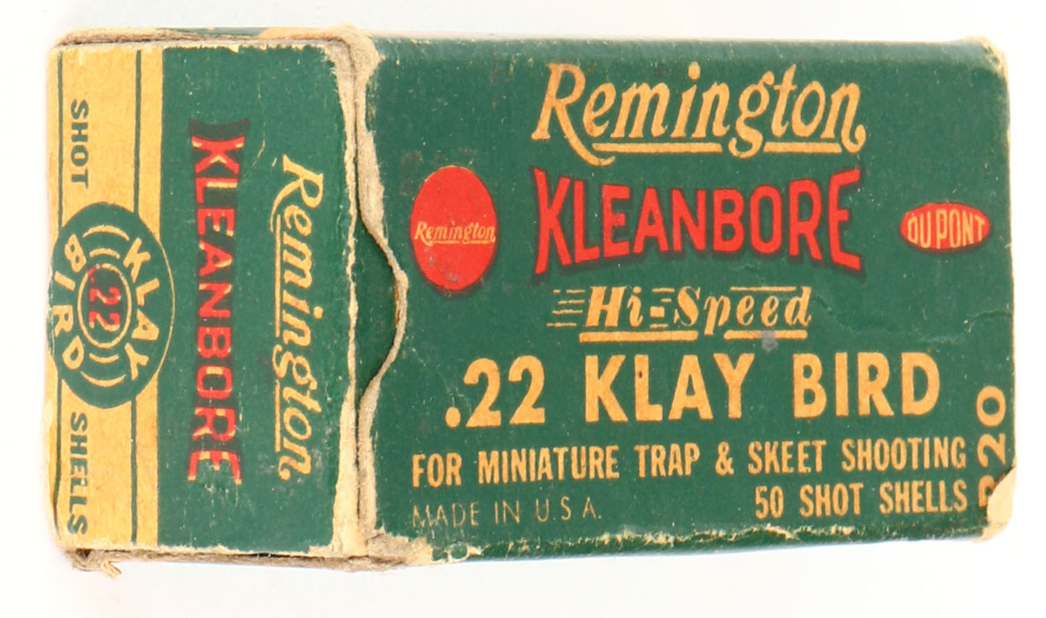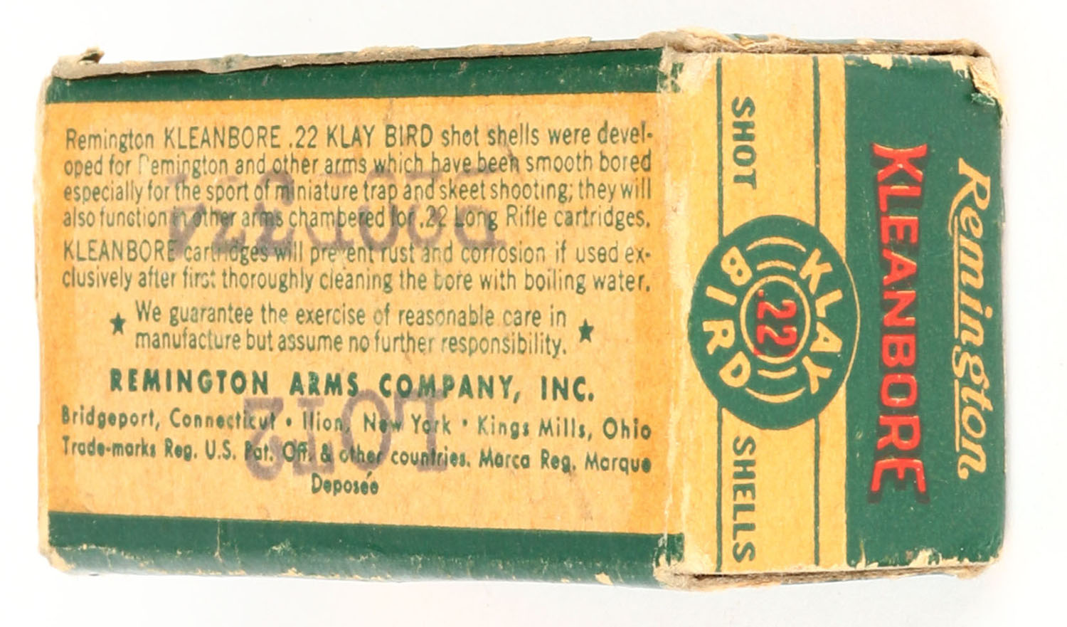 Remington, Kleanbore Hi-Speed, .22 Klay Bird, RHWeb: REM-10 LR-3a, Full, 1pc. Green buff & red box, box is solid with excellent color, very minor age soiling, some corner wear, minor edge wear, end flaps are solid, ammo is excellent. Grade: Very Good + - Value: 20 to 30