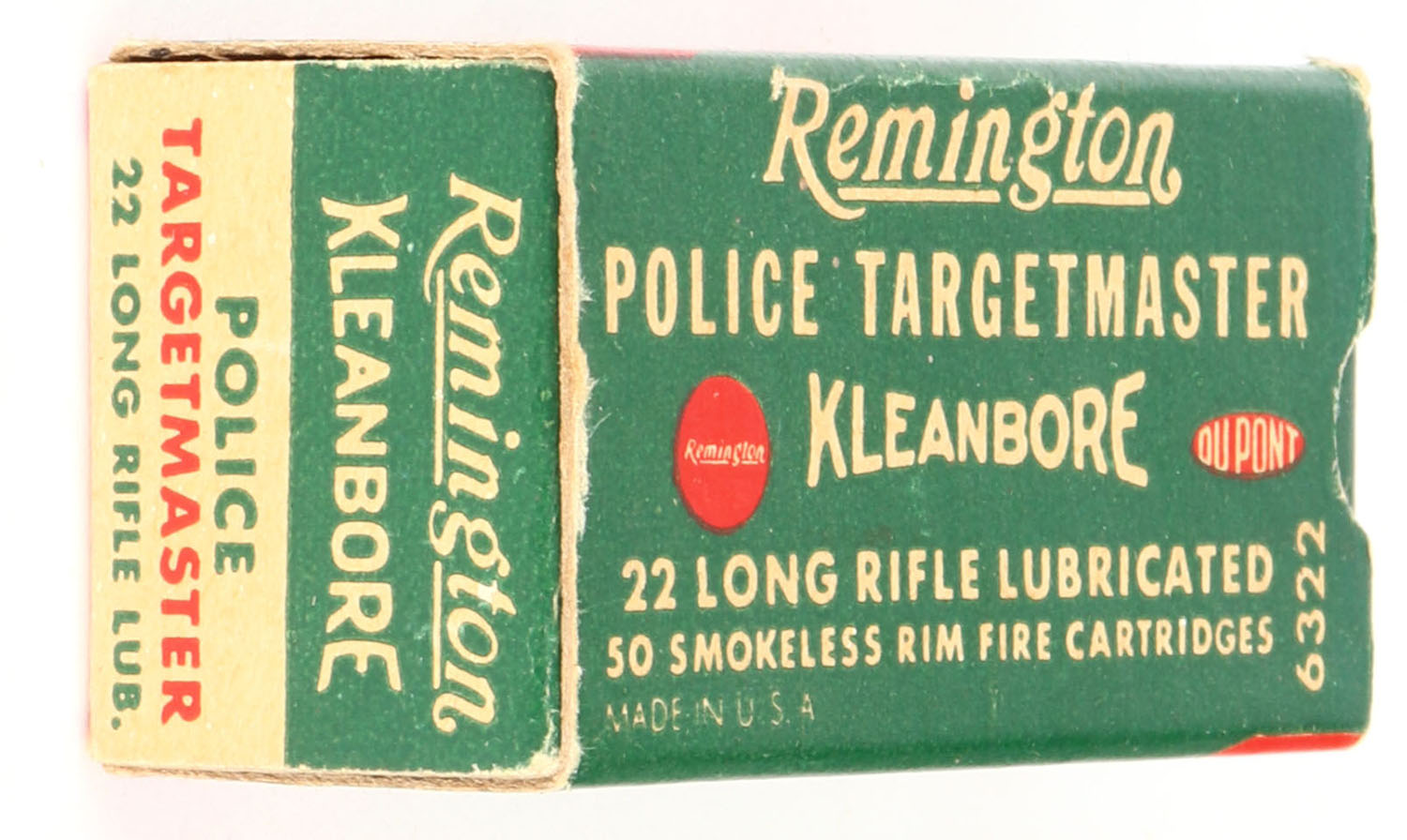 Remington, Police Targetmaster, .22 Long Rifle, Kleanbore, RHWeb: REM-69 LR-2c, Full, 1pc. Green buff & red box, box is solid with excellent color, very minor corner wear, edges are crisp, end flaps are solid, ammo is excellent. Grade: Excellent + - Value: 50 to 75