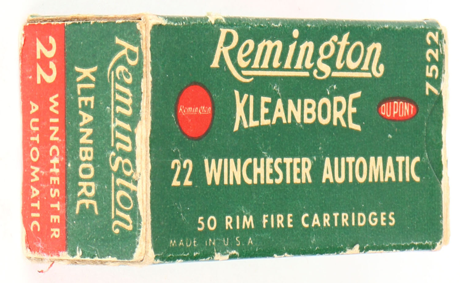 Remington, Kleanbore, .22 Winchester Automatic, RHWeb: REM-12 WA-1b, Partial 39rds., 1pc. Green white & red box, box is solid with excellent color, some edge & corner wear, end flaps are solid, ammo is excellent. Grade: Very Good ++ - Value: 20 to 30