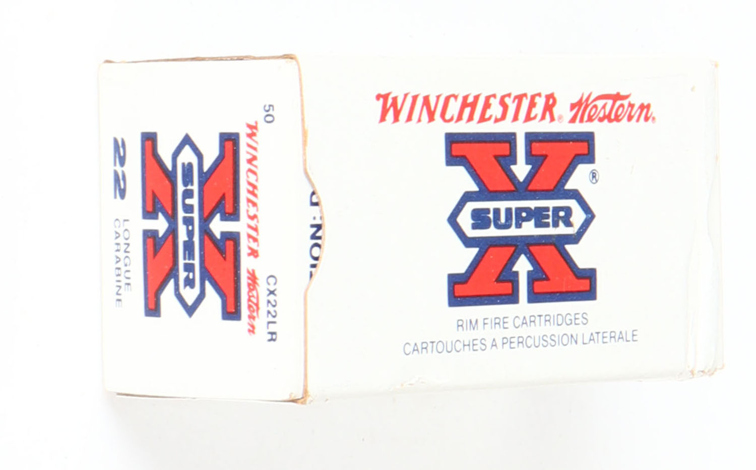 Winchester-Western (Canada), .Super X, .22 Long Rifle, RHWeb: (Canada) WRA-6 LR-1b, Full, 1pc. White red & black box, box is solid with minty color, corner ding on top front corner, corners otherwise mostly sharp, edges are crisp, end flaps are solid, ammo is minty. Grade: Excellent + - Value: 20 to 30