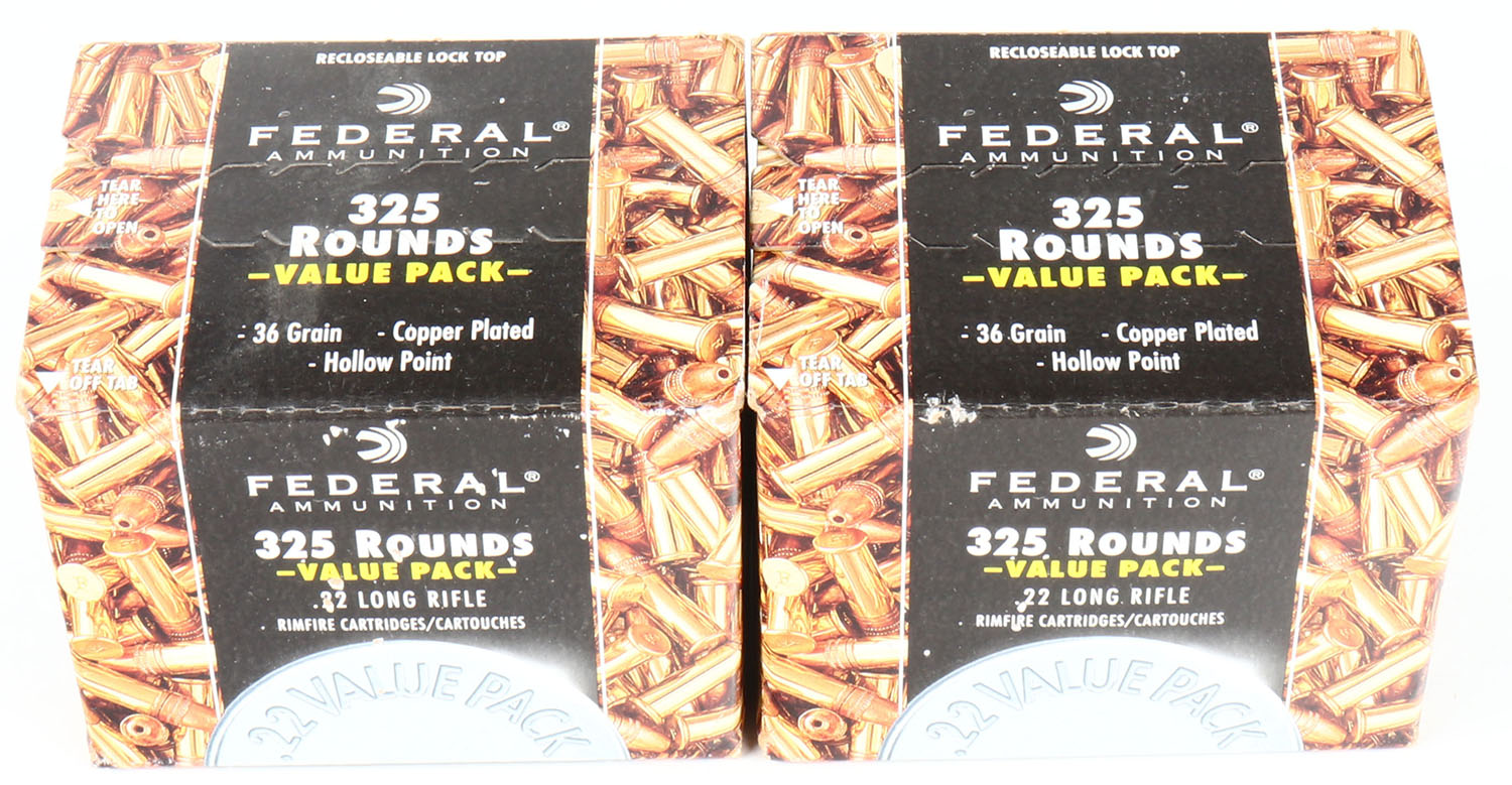 Federal, Lot of (2), Value Pack, .22 Long Rifle, 36 Grain Copper Plated Hollow Point, both boxes FULL & SEALED, 325rds. (x2) 1pc. Multi-colored box, boxes are MINT with mint color, corners are sharp, edges are crisp. Grade: MINT - Value: 40 to 60